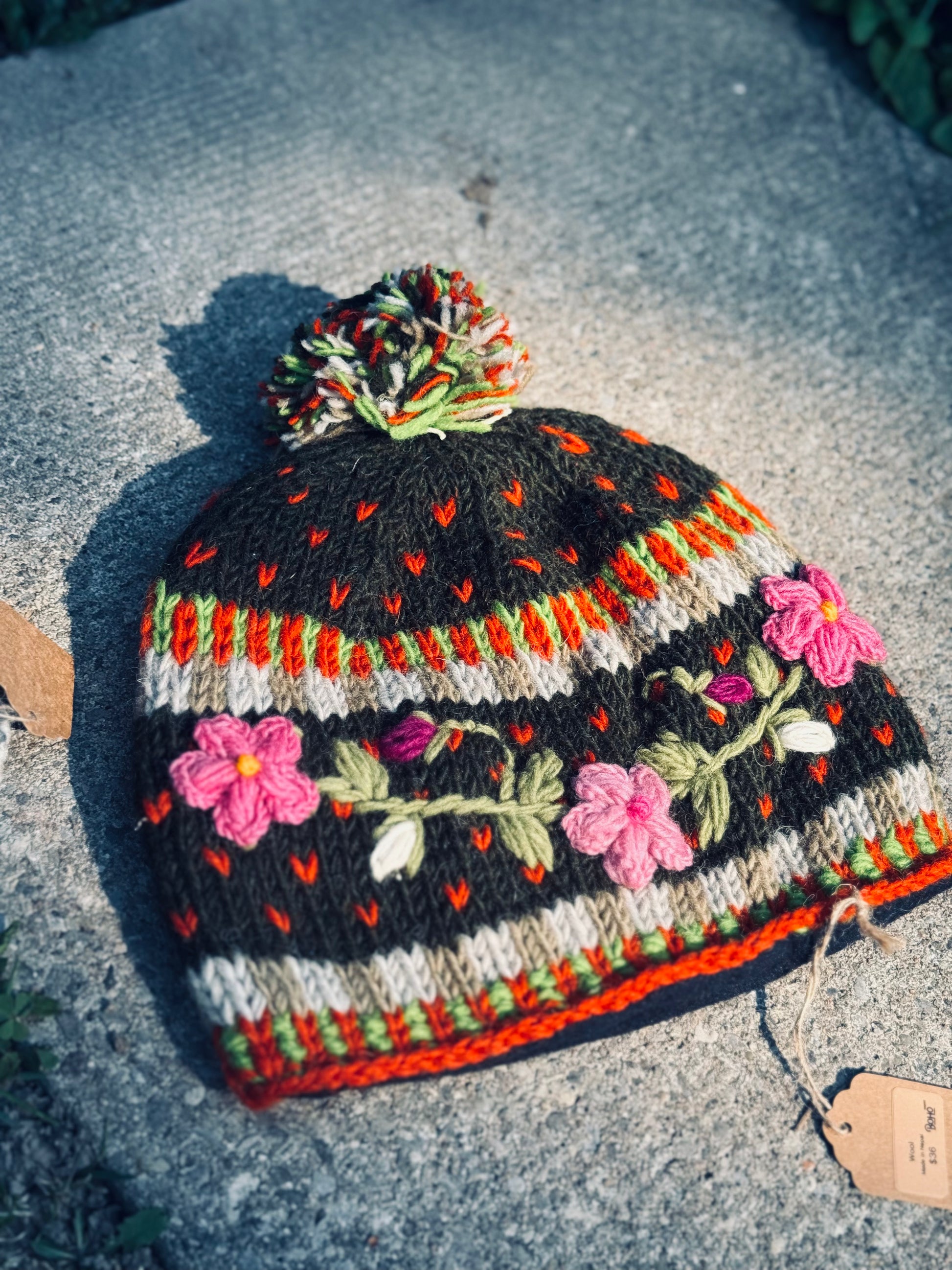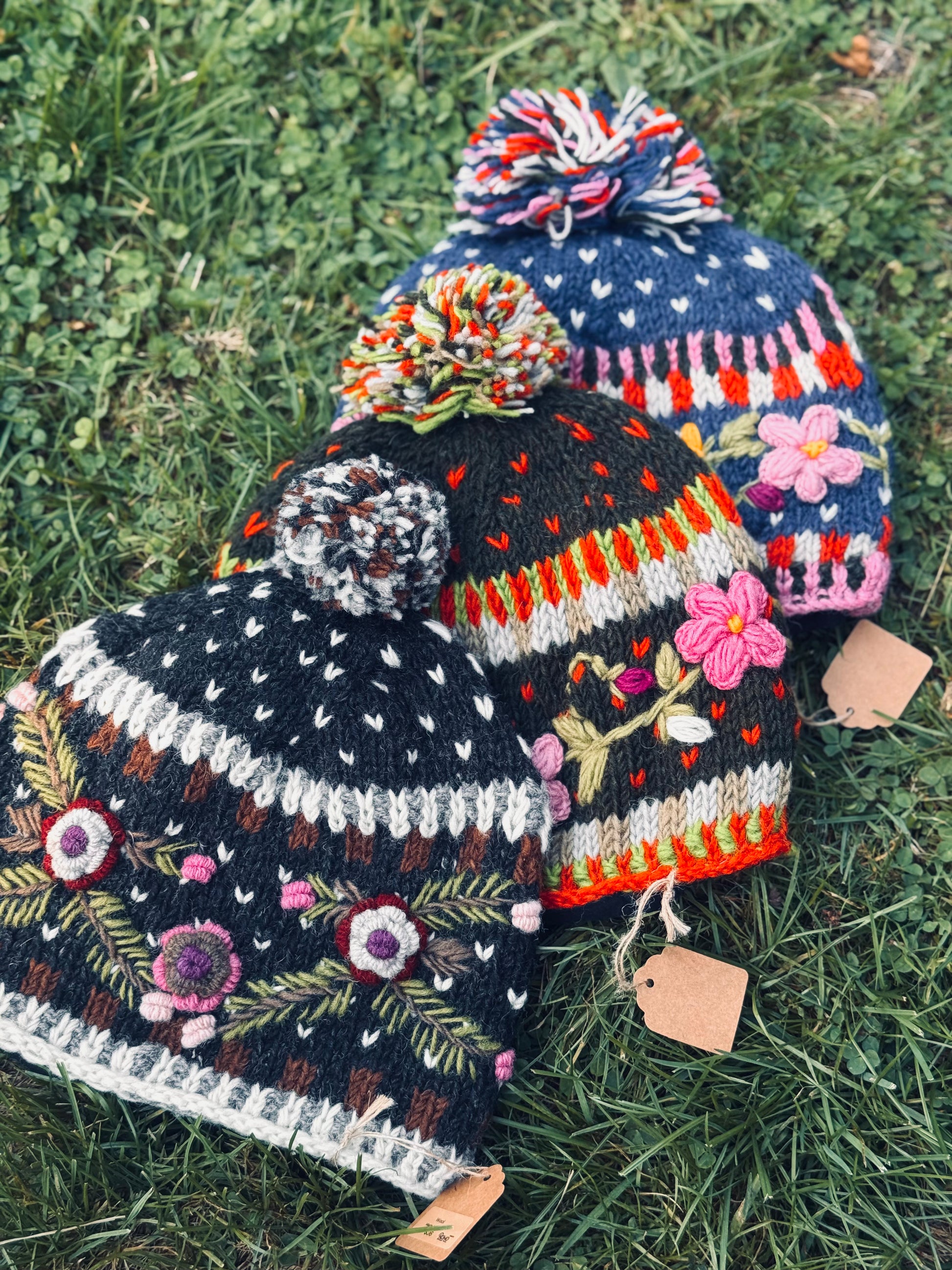 Each of these cozy wool hats is hand-knit and embroidered by artisans in Nepal, blending traditional craftsmanship with cheerful modern color.