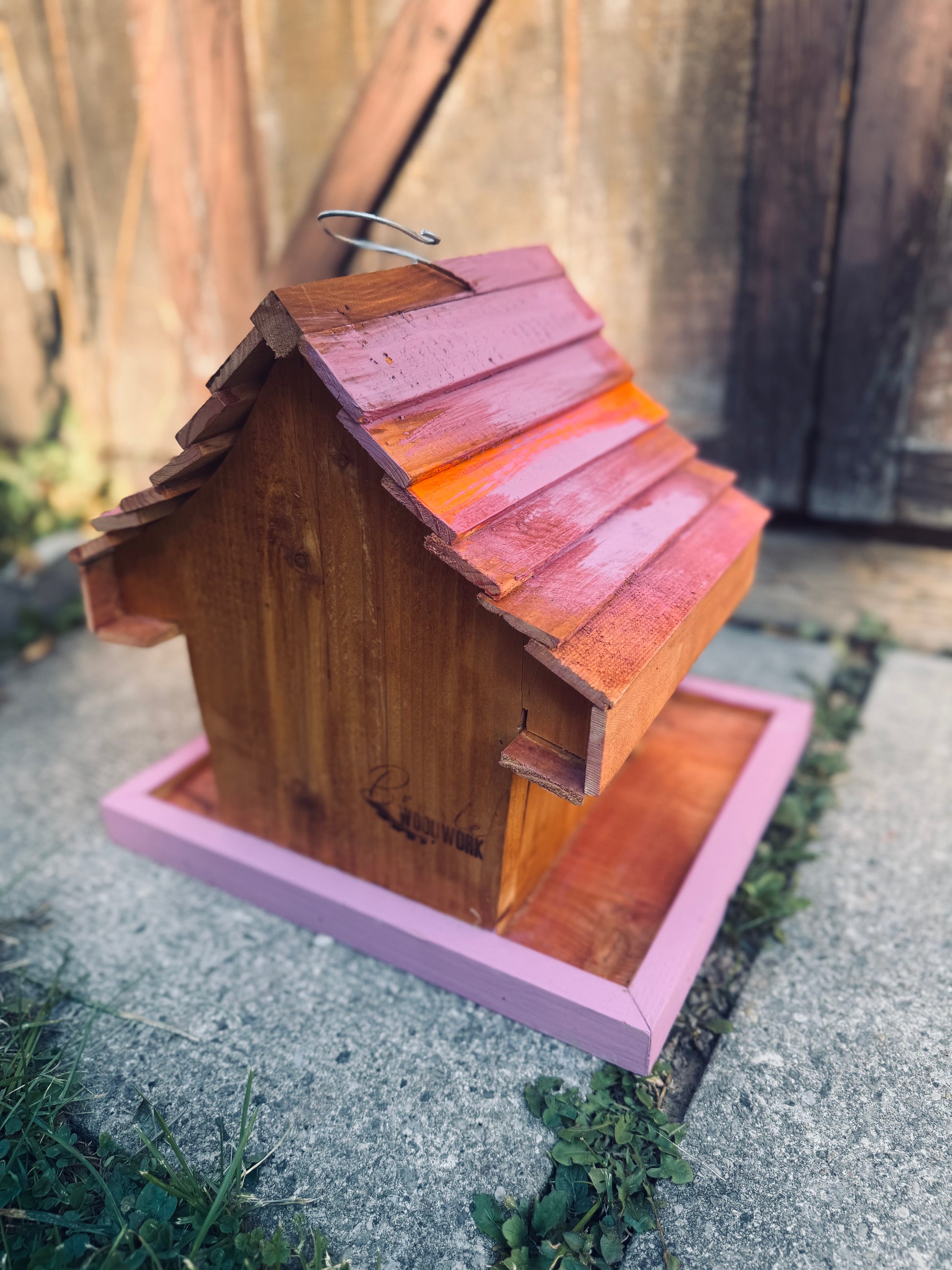 Warm, bold, and full of personality — the Sunset Cottage Edition captures the glow of golden-hour light in a handcrafted cedar birdhouse. Its soft lavender trim, coral-red door, and gently sloped cedar roof (touched with a hint of orange) make it a cheerful piece for your garden or porch.