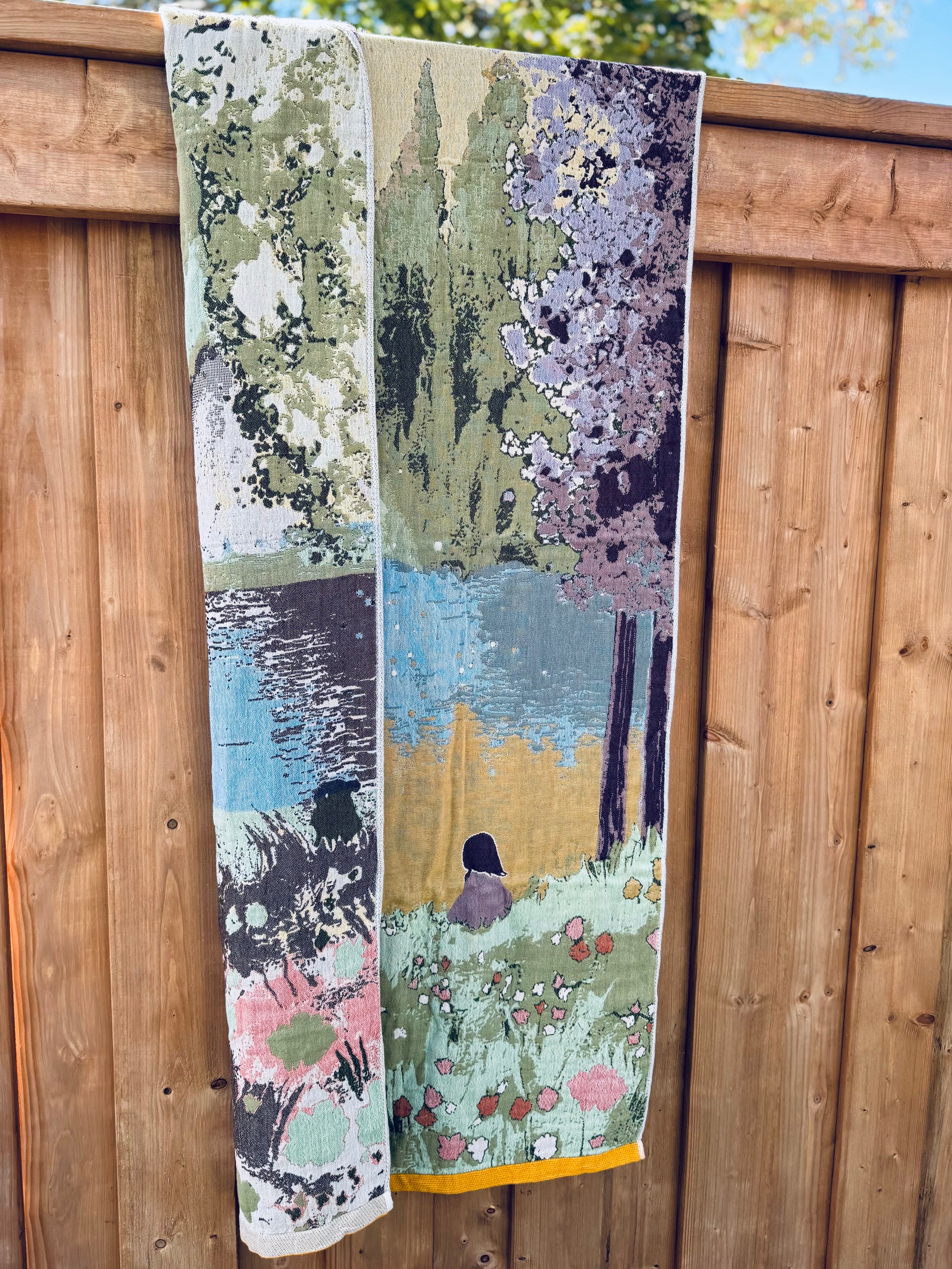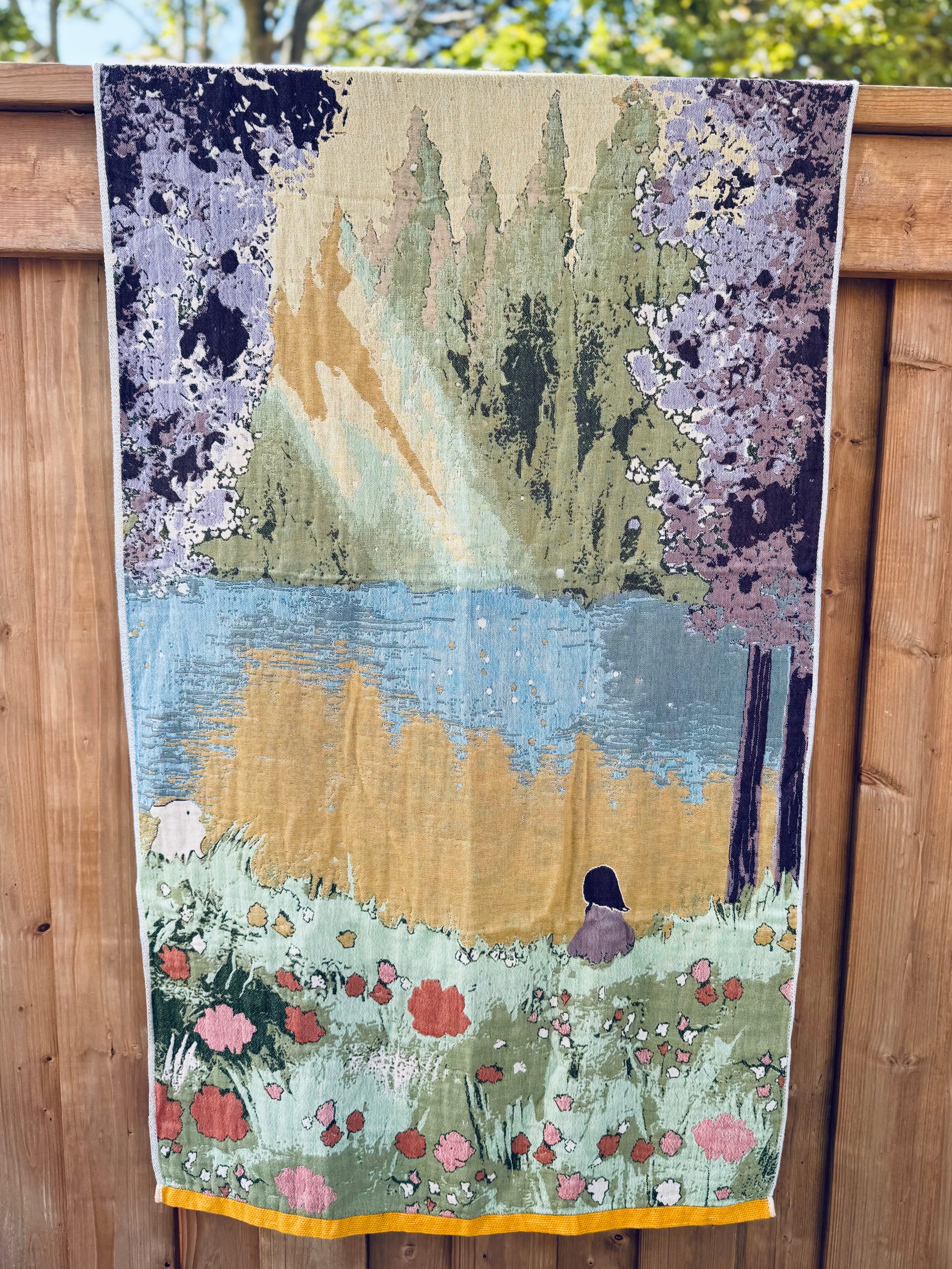 This 100% long-staple cotton woven towel captures a dreamy scene of nature and quiet reflection. Candy-soft, breathable, and highly absorbent — perfect as a bath towel, beach throw, or even displayed as a tapestry.