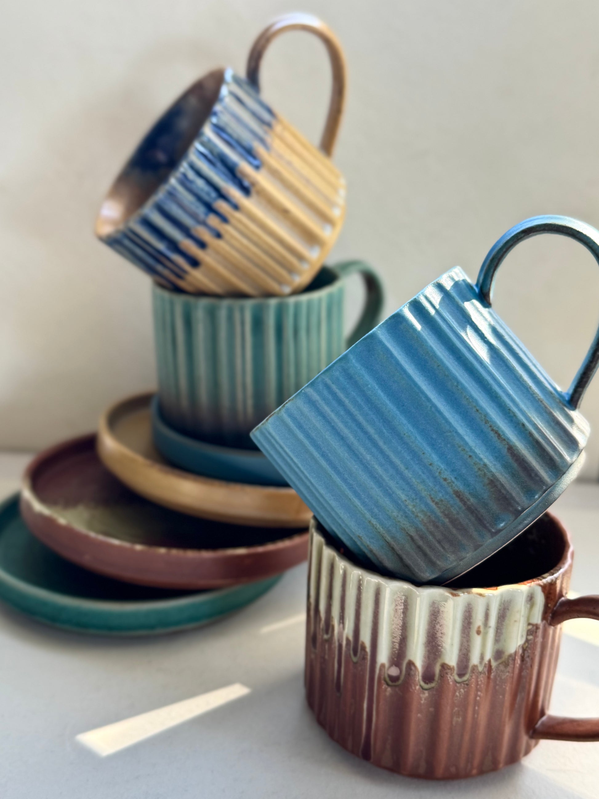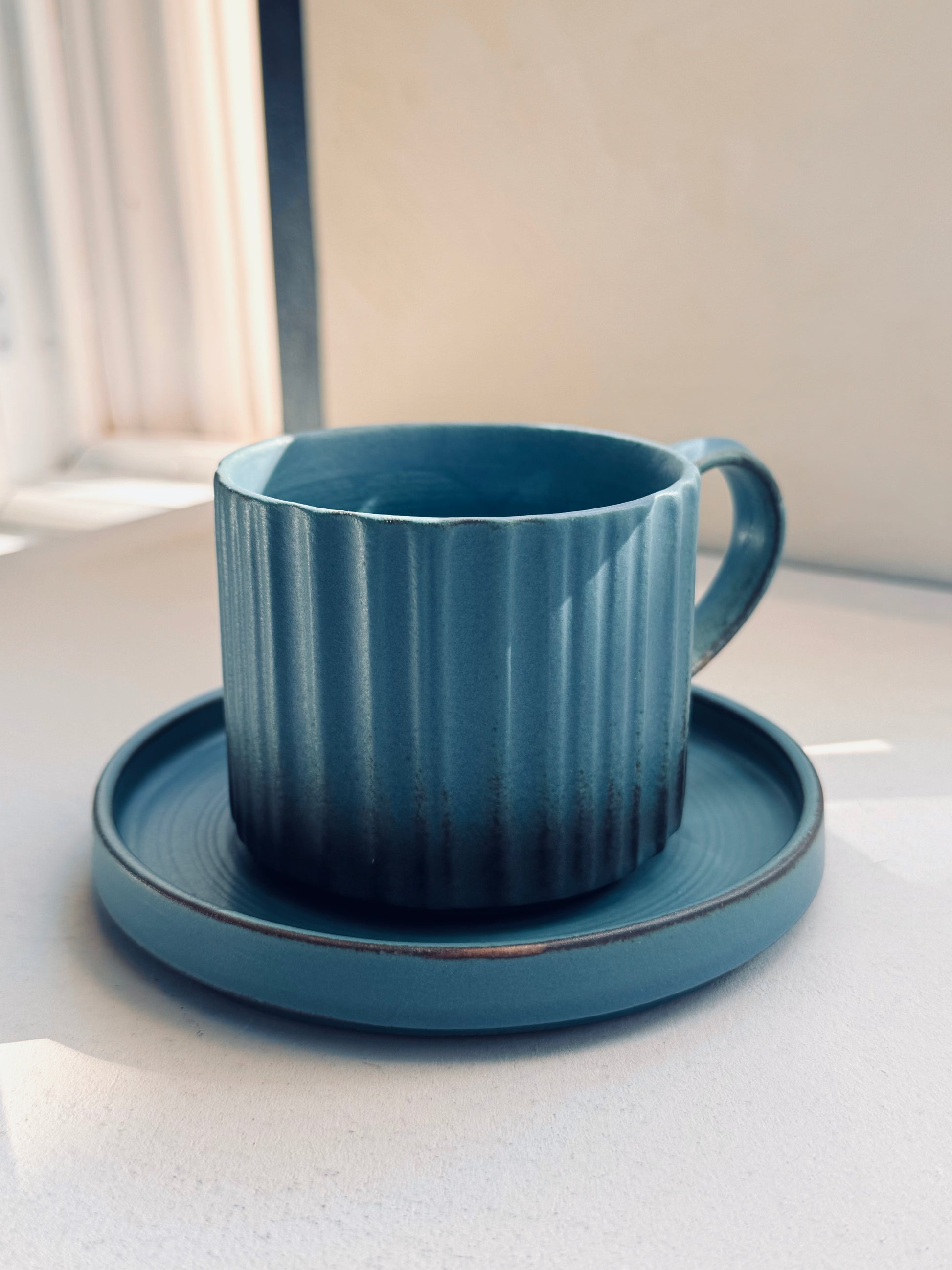 A modern ceramic cup and saucer set designed with vertical ridges and a smooth matte glaze. The ocean-blue finish gives it a clean, minimalist look while the matching saucer makes it perfect for daily coffee, tea, or hot chocolate.