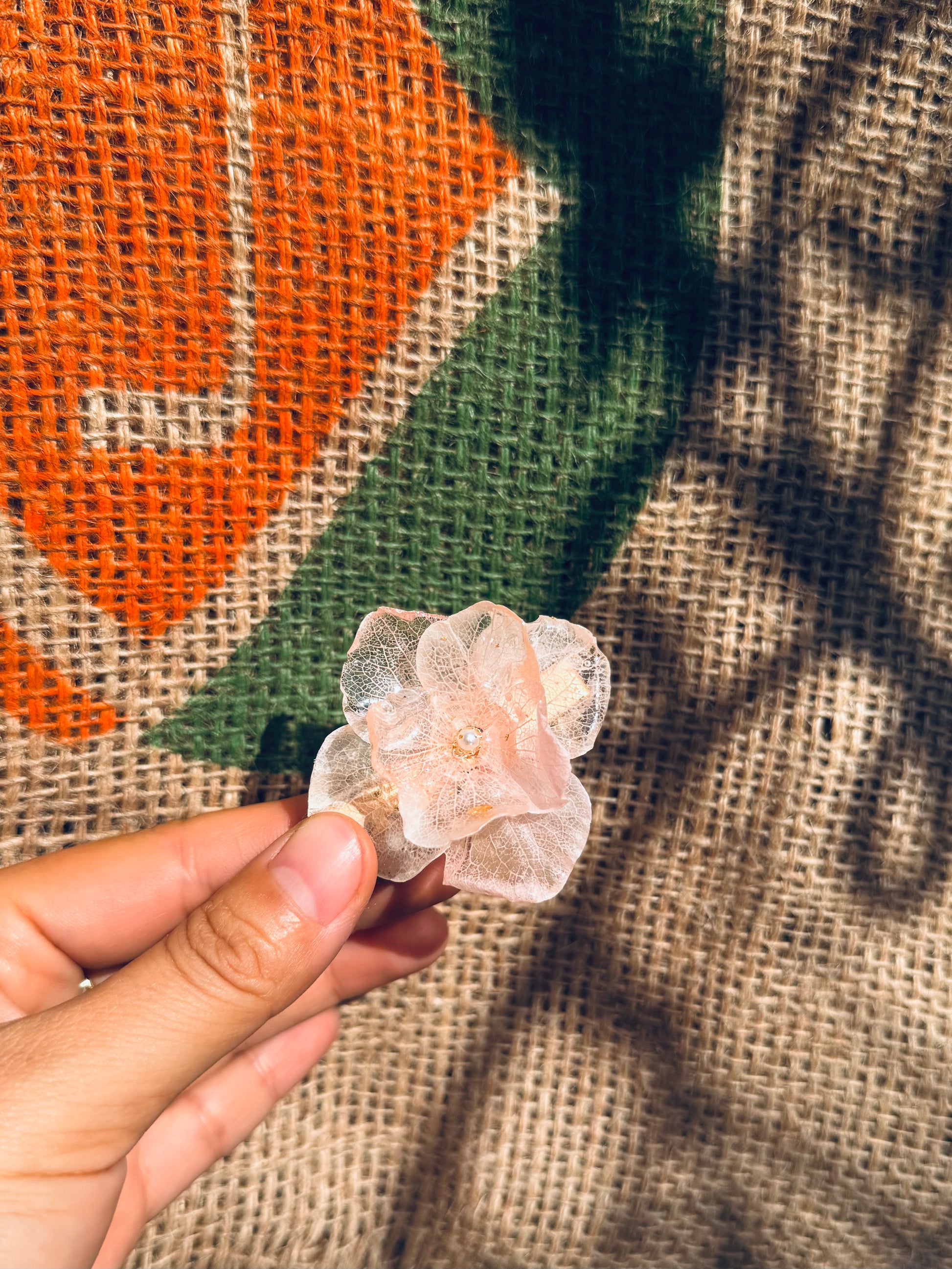 This handmade clip features a real hydrangea petal sealed with a glossy finish and accented with a tiny faux pearl center.