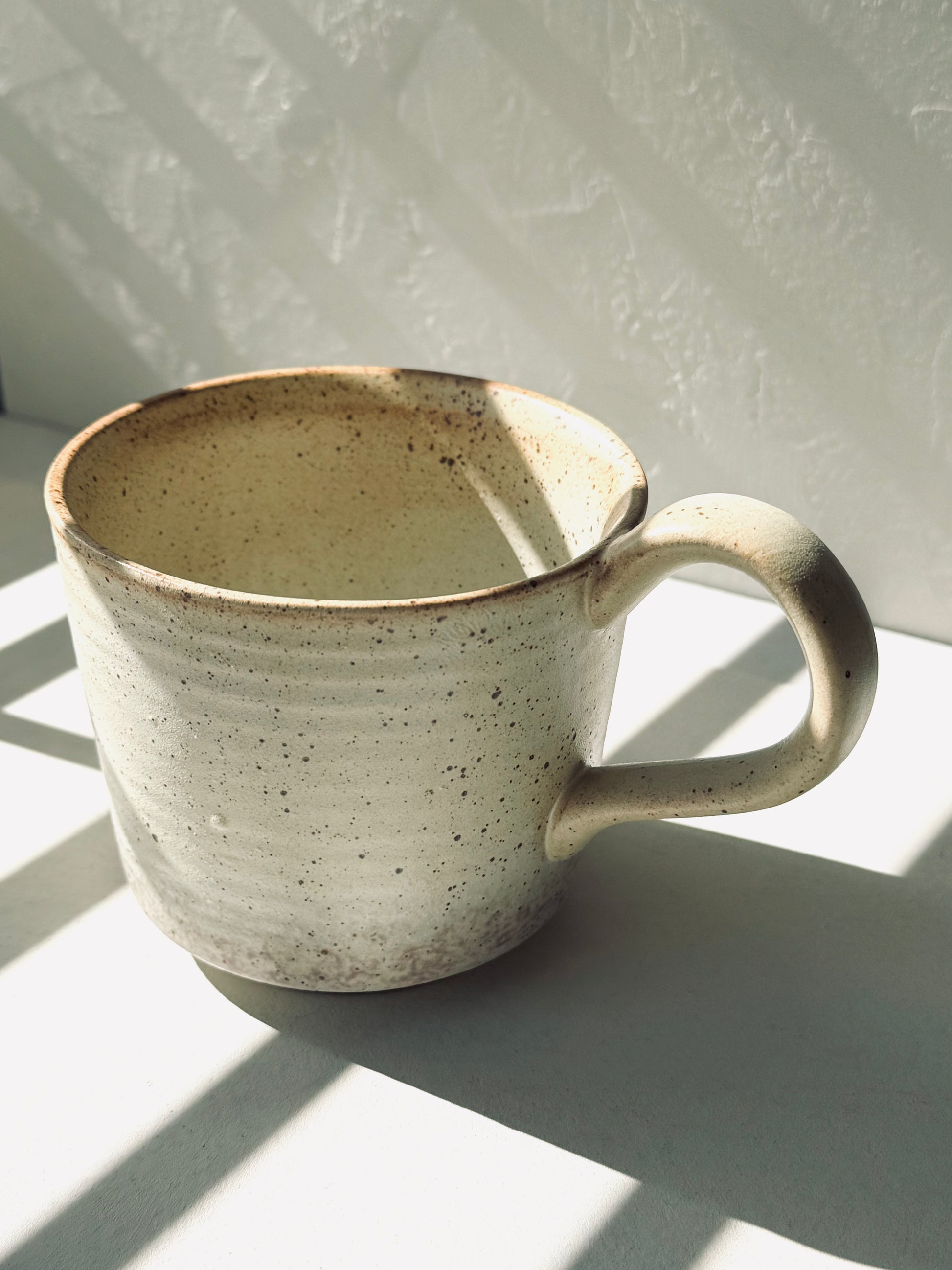 Handcrafted from natural ceramic clay, this mug features a soft beige tone with organic speckling and a subtle brown rim. Its minimalist form and raw texture make it perfect for everyday rituals — from morning coffee to quiet afternoon tea.