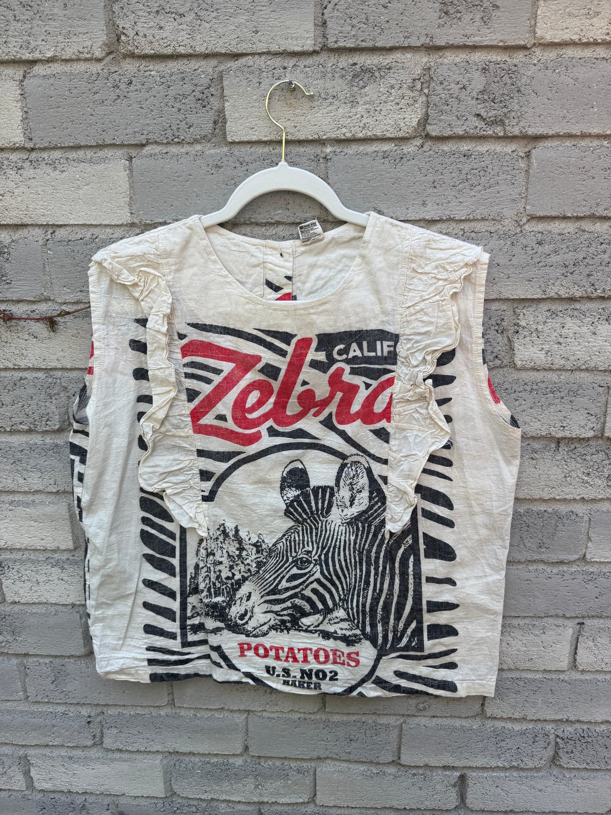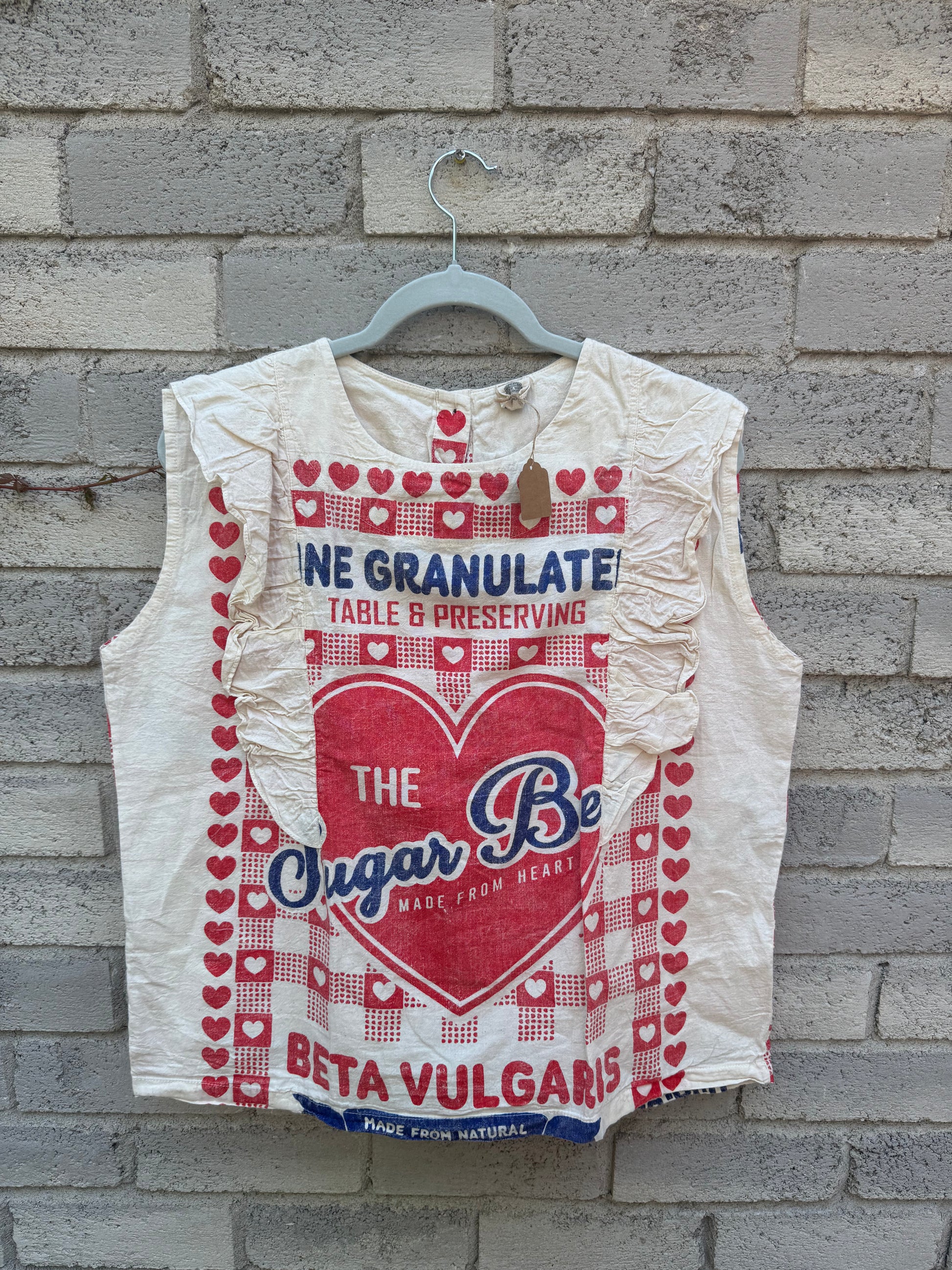 This top features an iconic rice sack βDuo Rabbitβ print with soft ruffle details at the shoulders and a surprise full-button back. Itβs a fun and feminine twist on a workwear classic β perfect for layering or wearing solo on warm days.