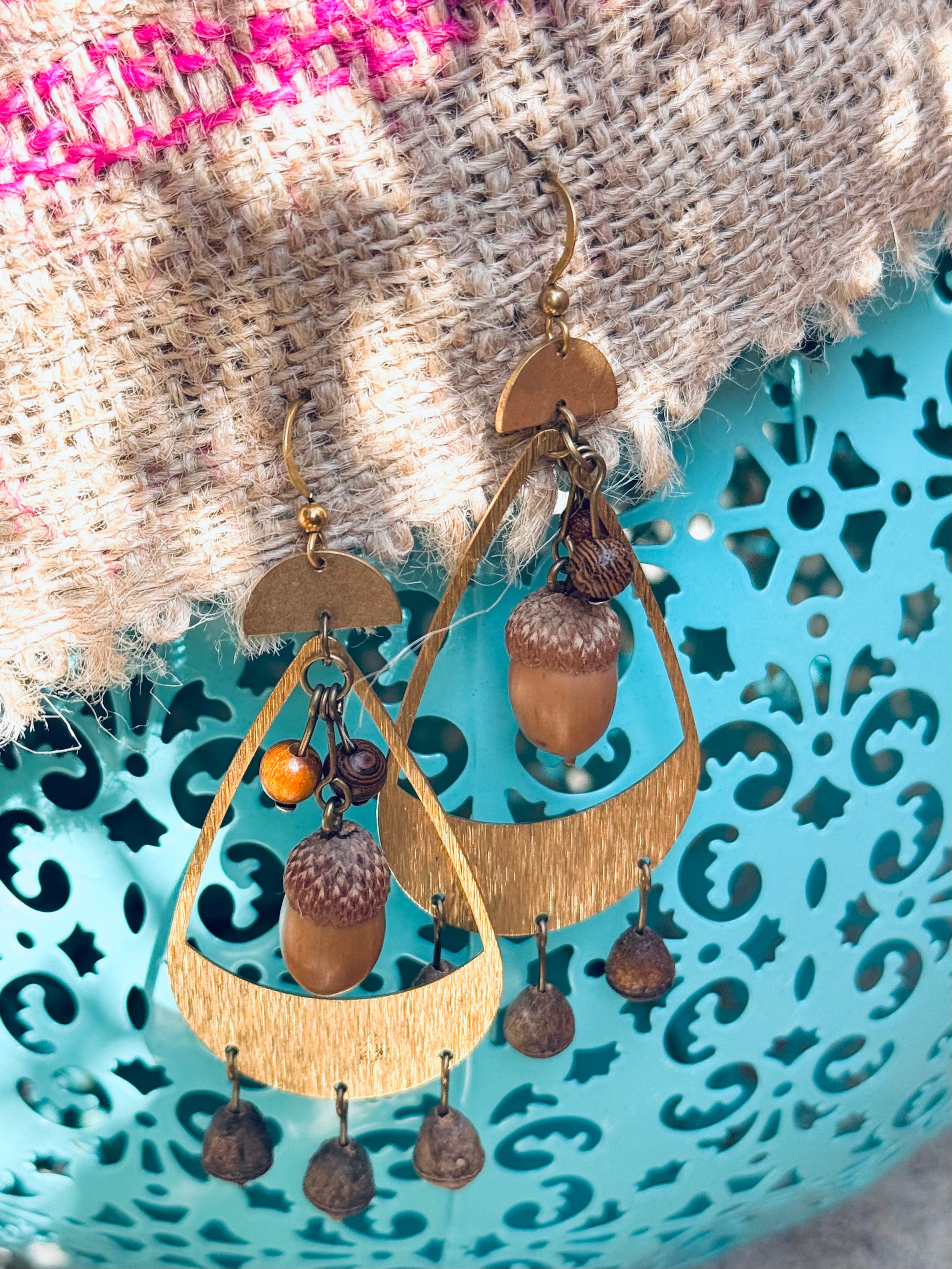 These playful earrings combine real acorns, natural bell pods, and warm copper accents to celebrate woodland charm in every detail. The golden teardrop frame adds a gentle shimmer — like sunlight filtering through the trees.
