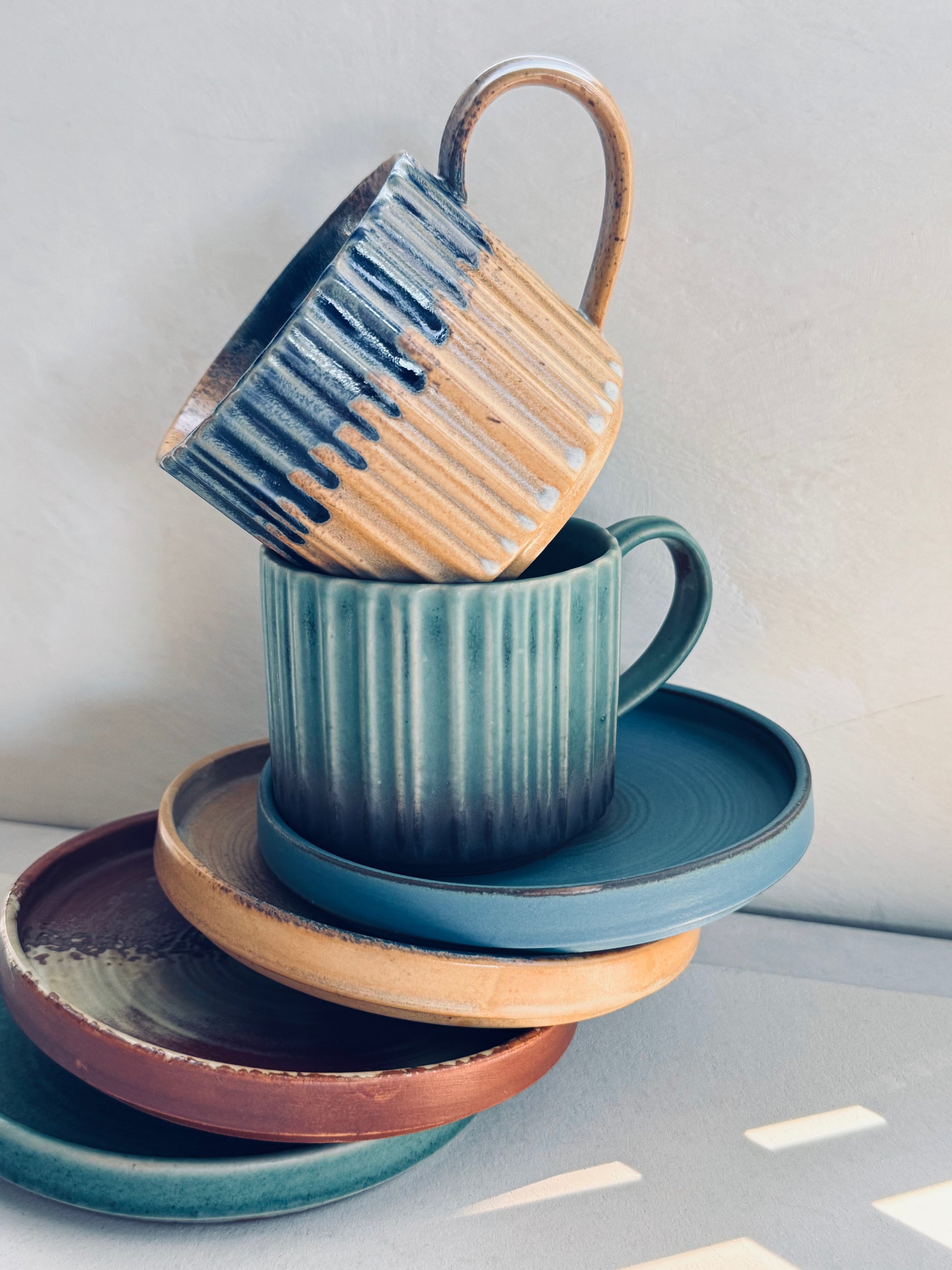 A ribbed ceramic cup with matching saucer, finished in a calming gradient green glaze. Its simple, modern design pairs durability with style, making it ideal for everyday coffee, tea, or hot drinks.