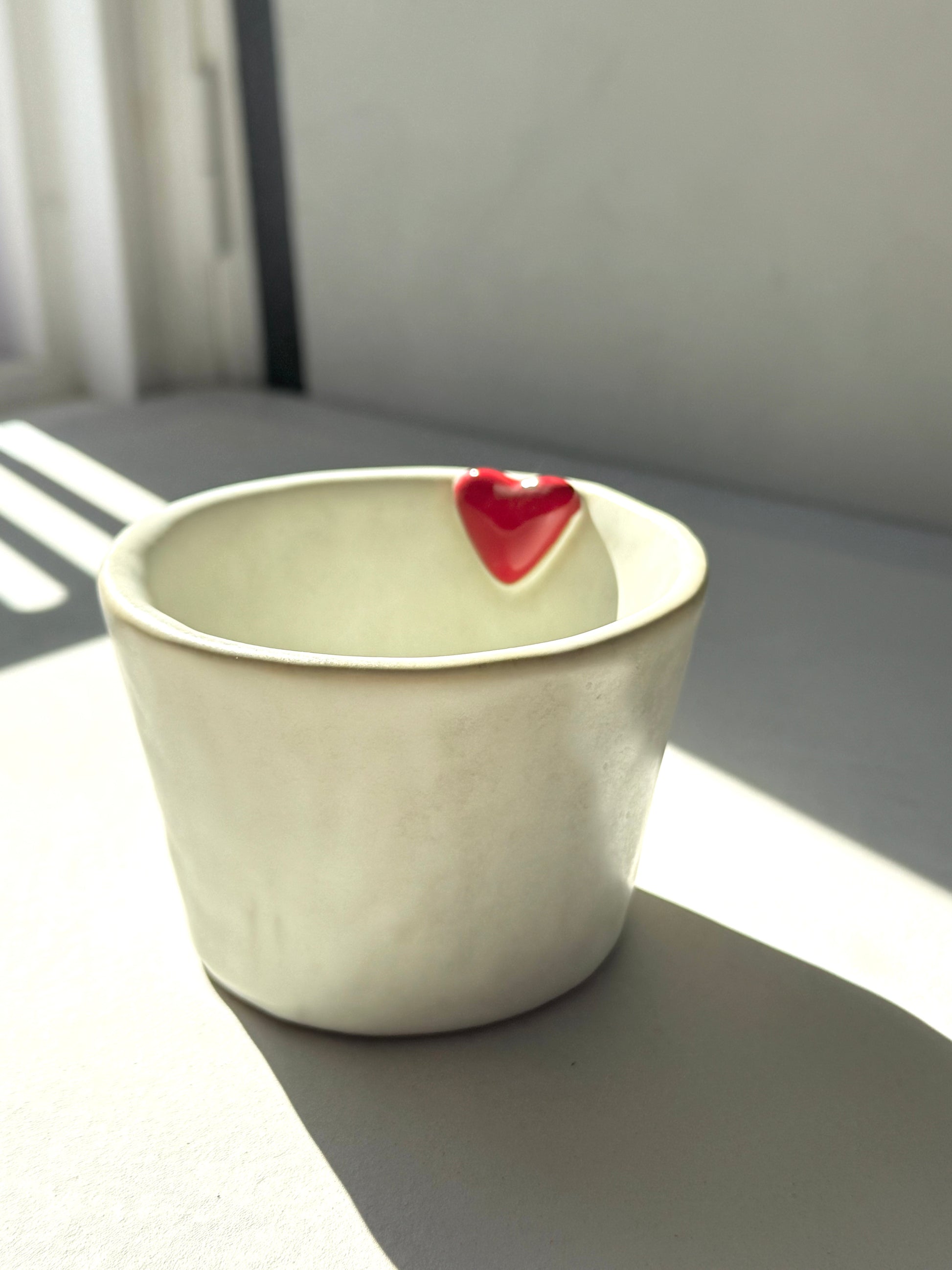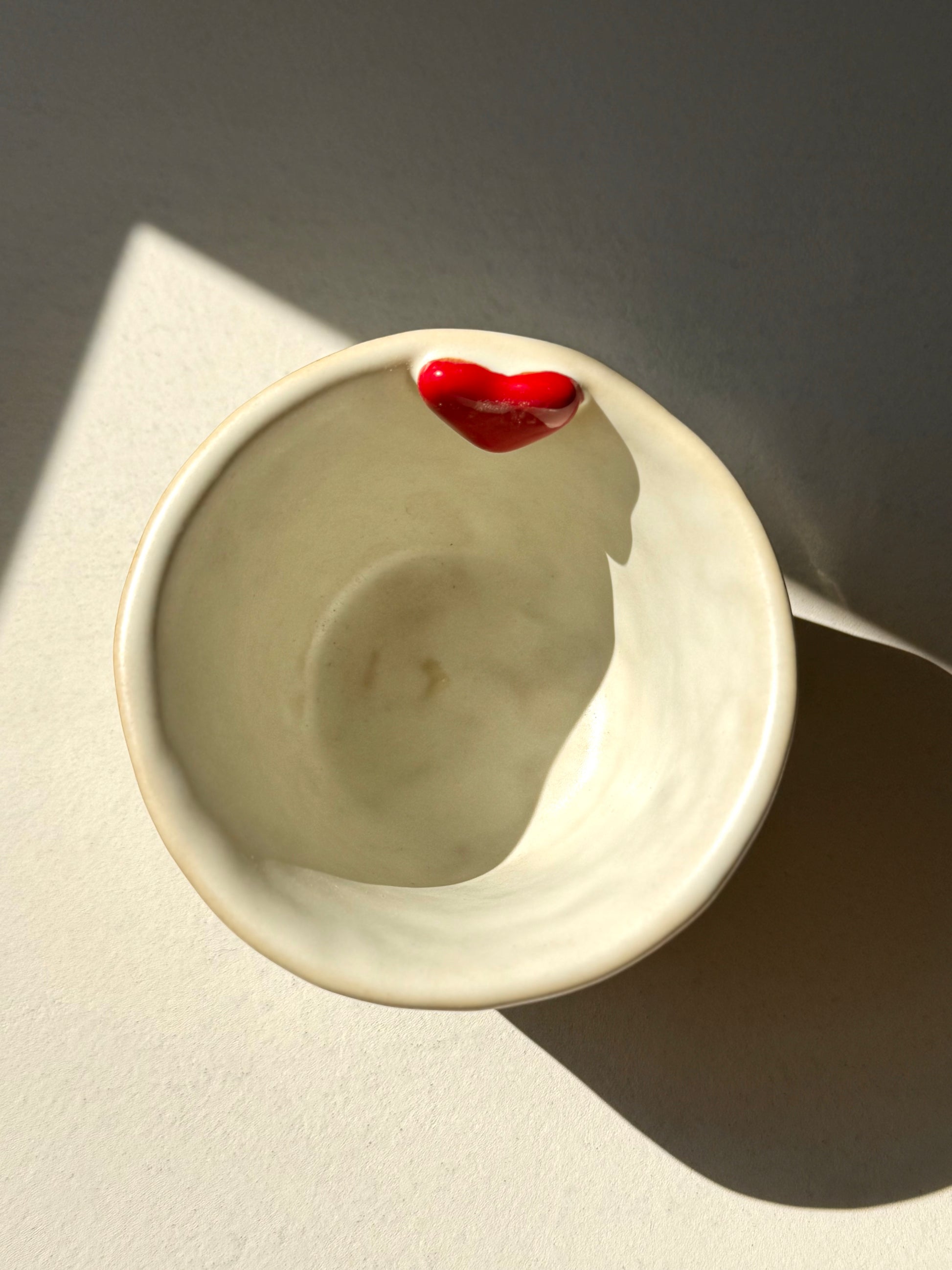 Each piece is handcrafted and finished with a tiny red heart detail — perfect for morning coffee, tea, or dessert moments.