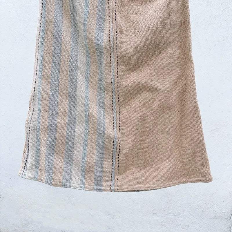 This handmade patchwork skirt is crafted from mixed cotton fabrics, featuring a soft, neutral color palette and a minimalist artisan design.