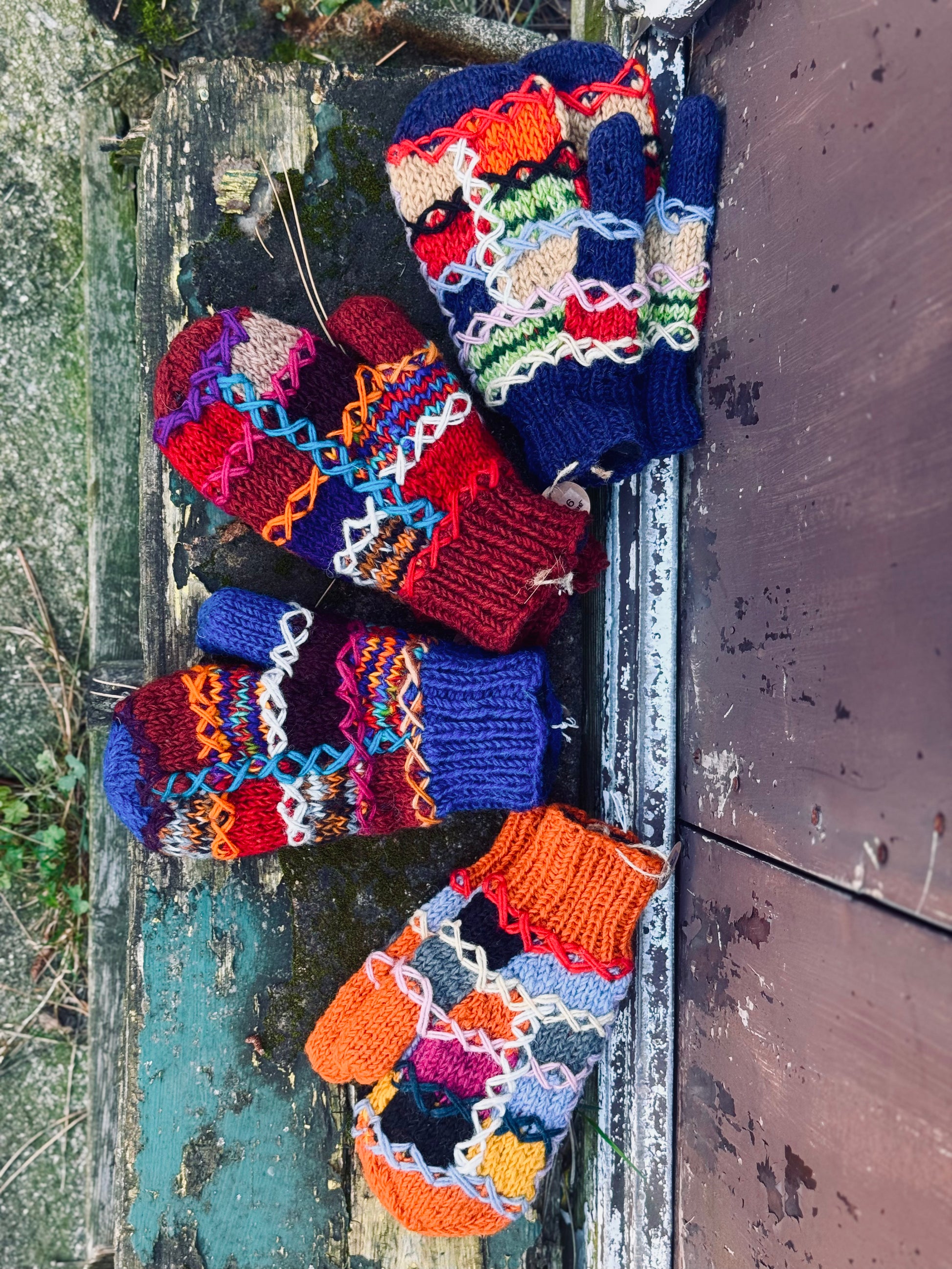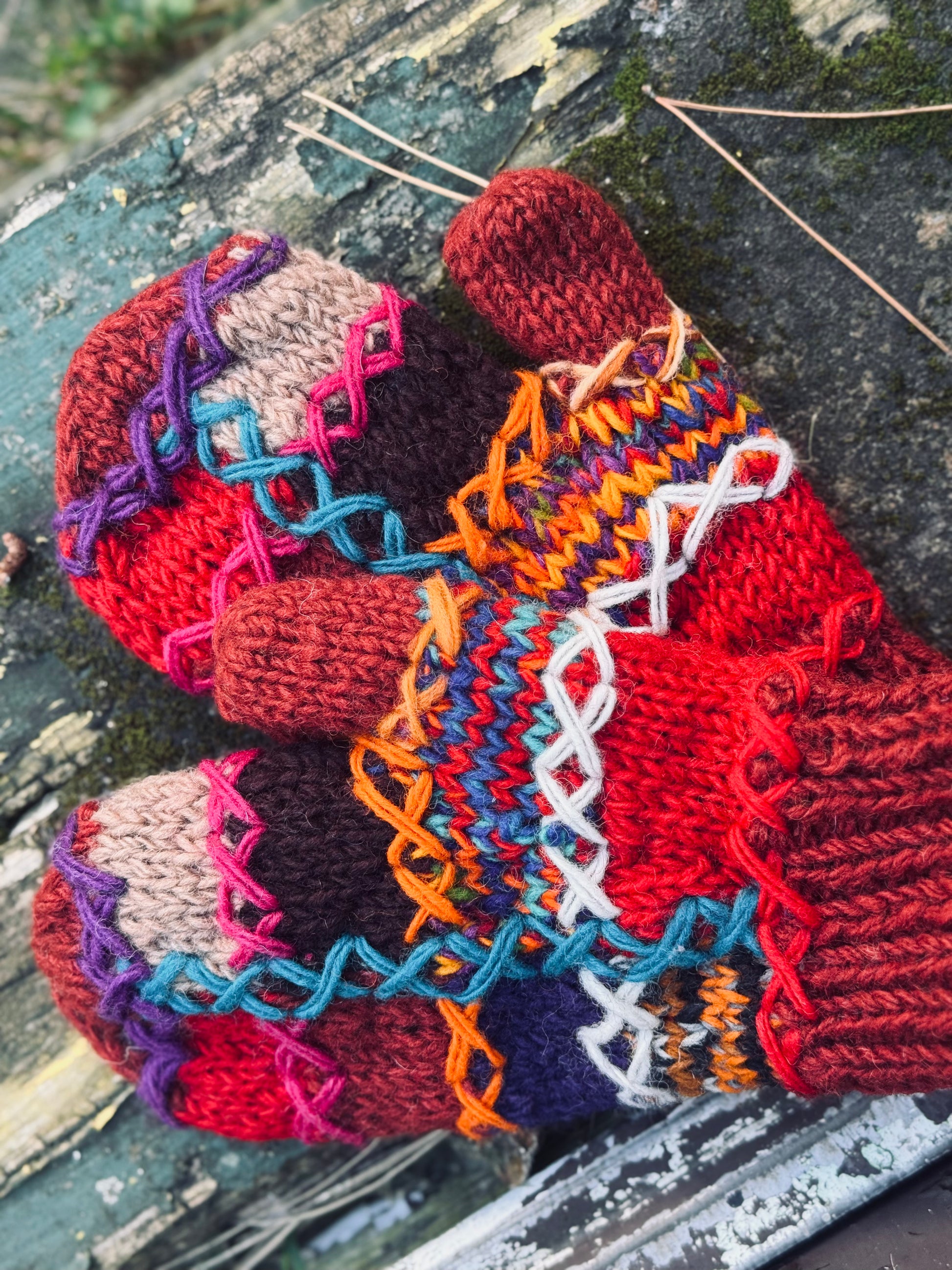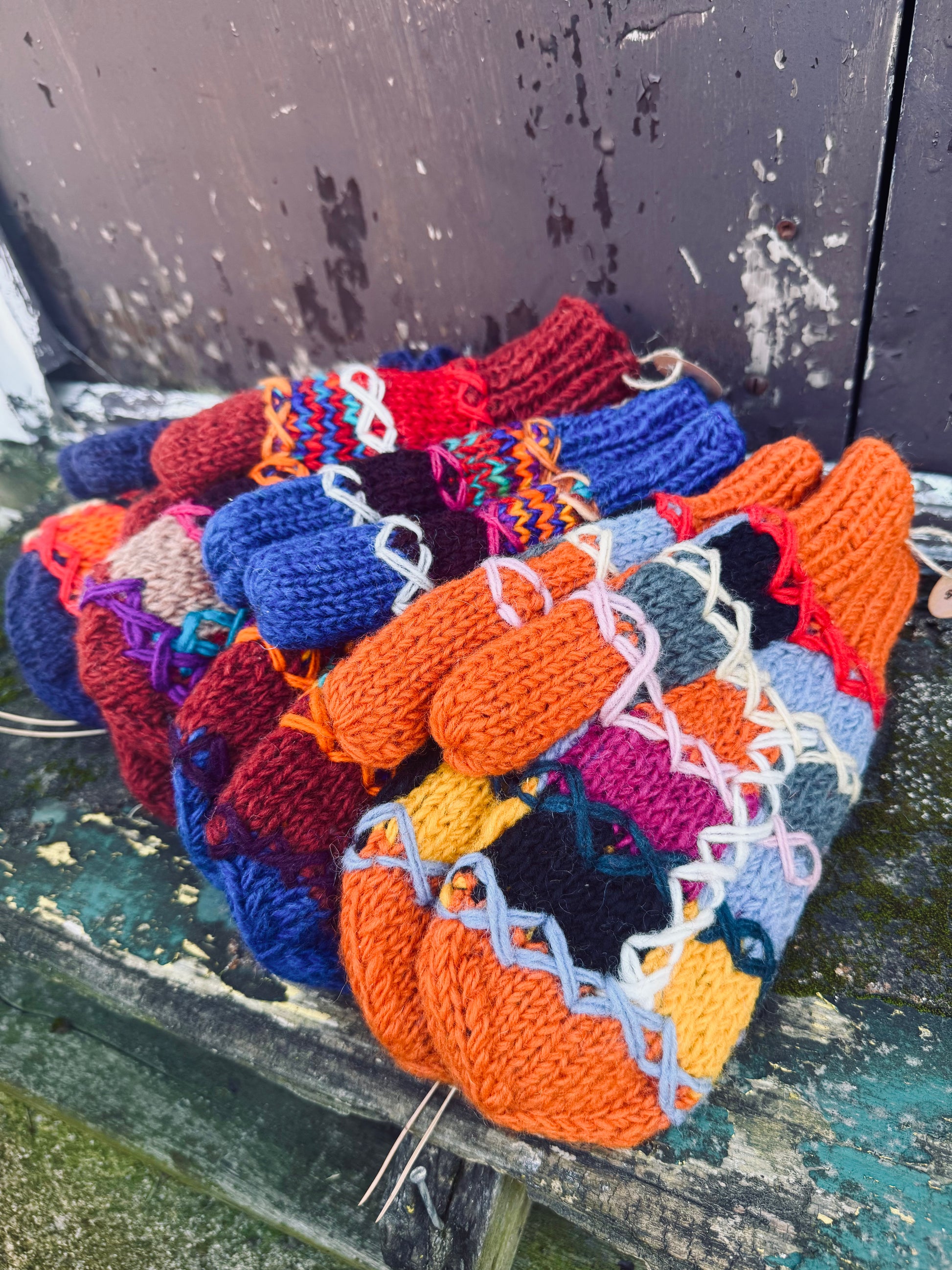 Each pair of these cozy wool mittens is hand-knit by artisans in Nepal using leftover wool yarn, making every pair truly one-of-a-kind.