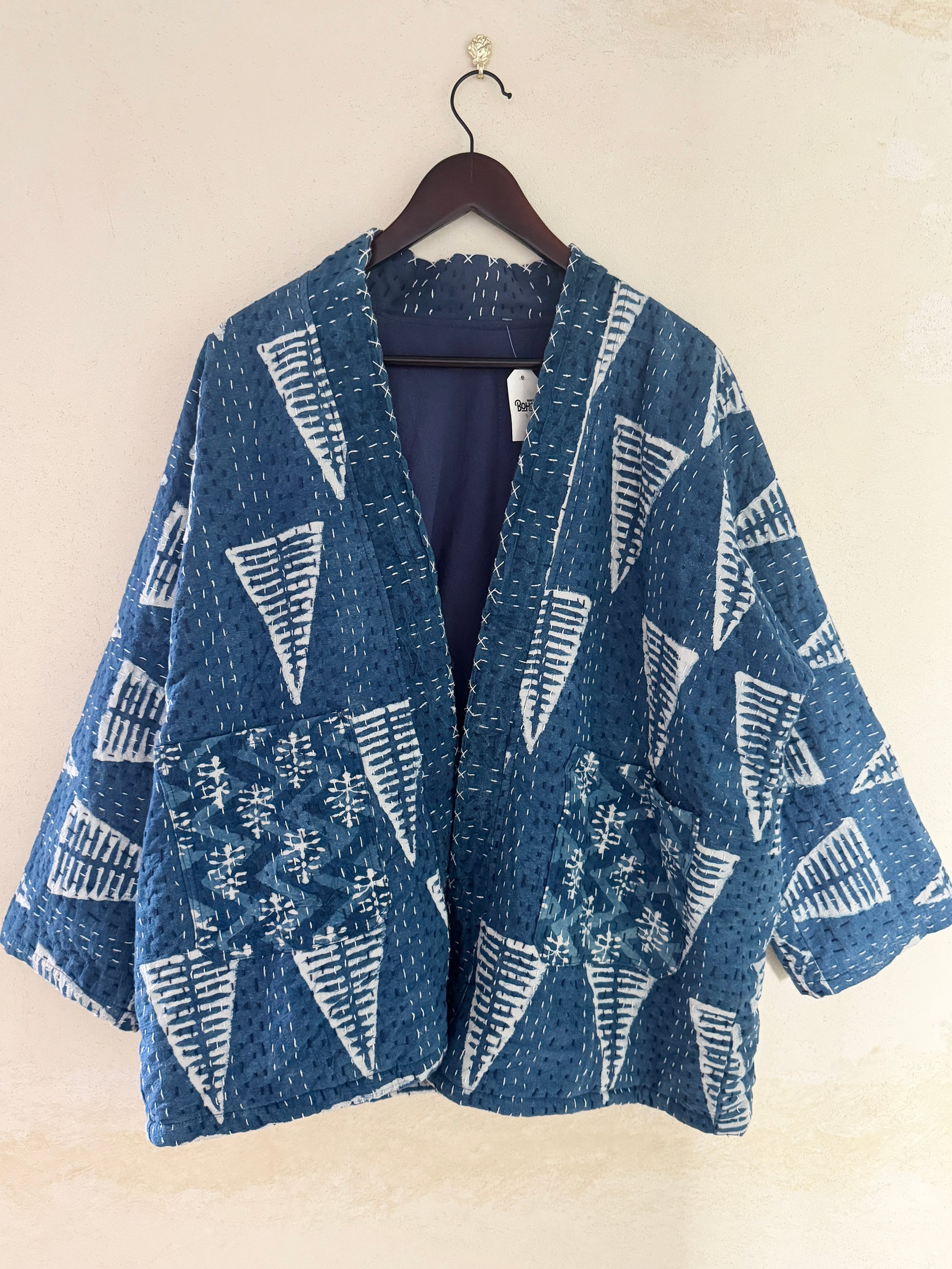 This artisan-made indigo jacket is crafted from traditional Indian cotton textiles and finished with hand stitching throughout. The quilted construction provides warmth without heaviness, making it ideal for everyday layering.
