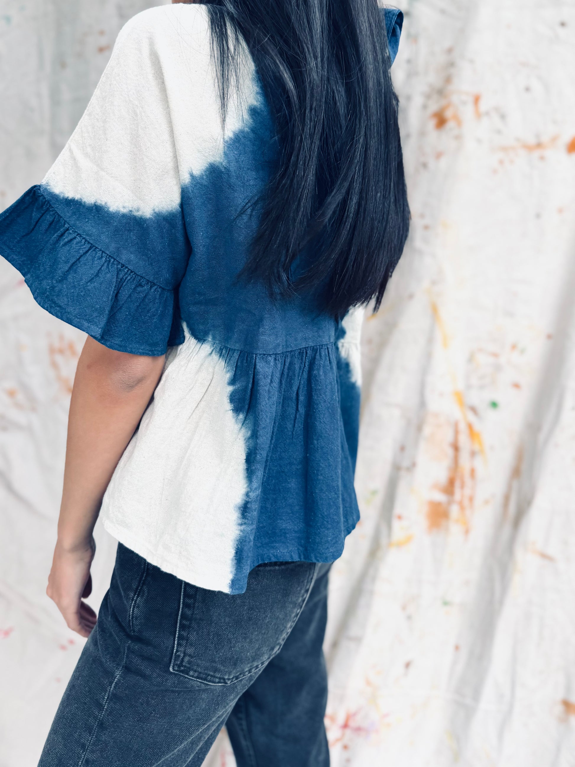 This indigo-dyed cotton top features soft ruffle sleeves, a flattering peplum waist, and an adjustable tie-back for a touch of charm. Handcrafted in small batches using natural indigo dye, each piece is truly one-of-a-kind.