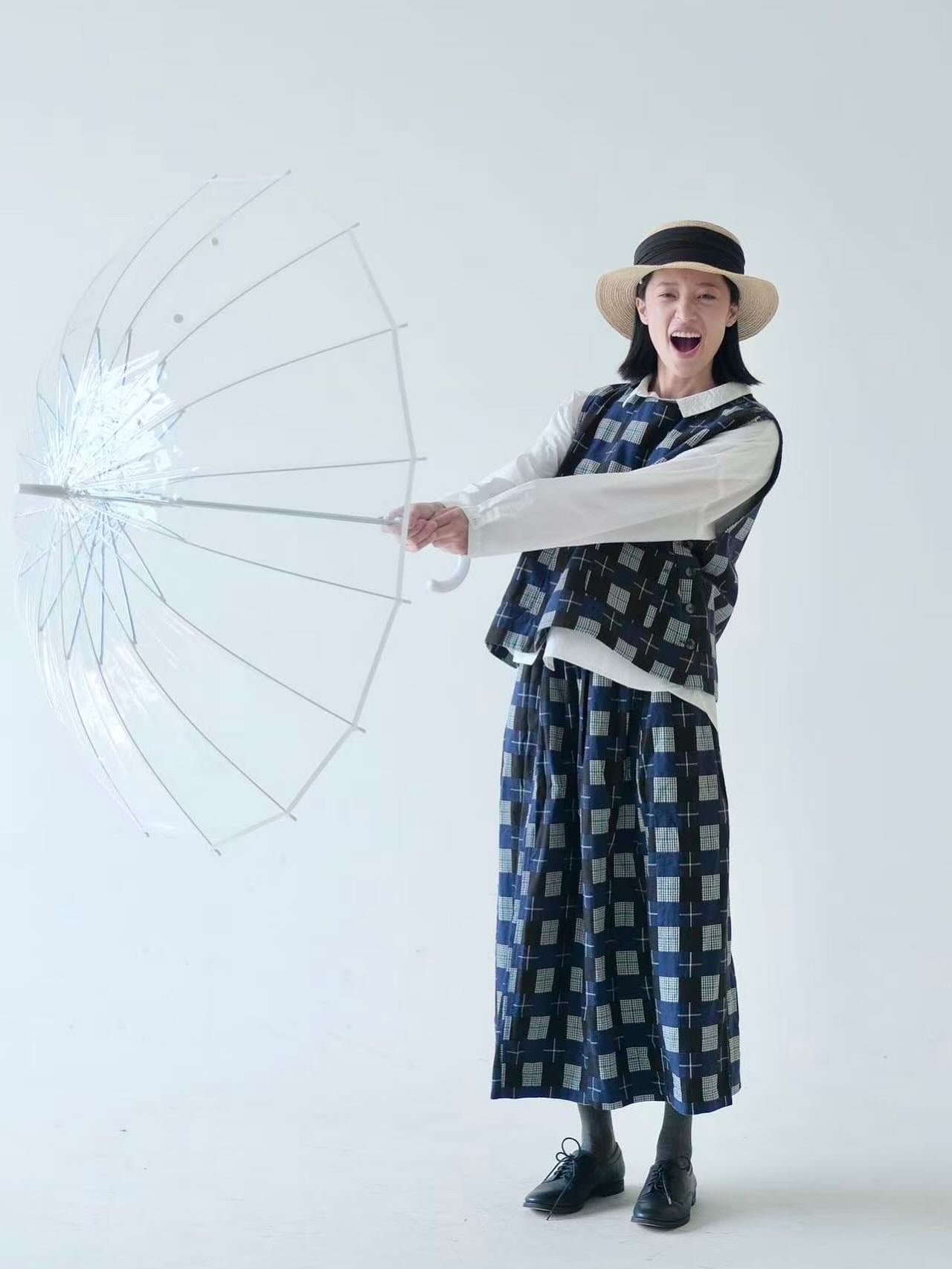 A modern Japanese-style vest made of 100% cotton with a navy checkered patchwork-inspired pattern. This versatile piece layers beautifully over shirts or dresses, adding texture and a unique touch to your look. Designed with clean lines and a relaxed fit for everyday comfort.