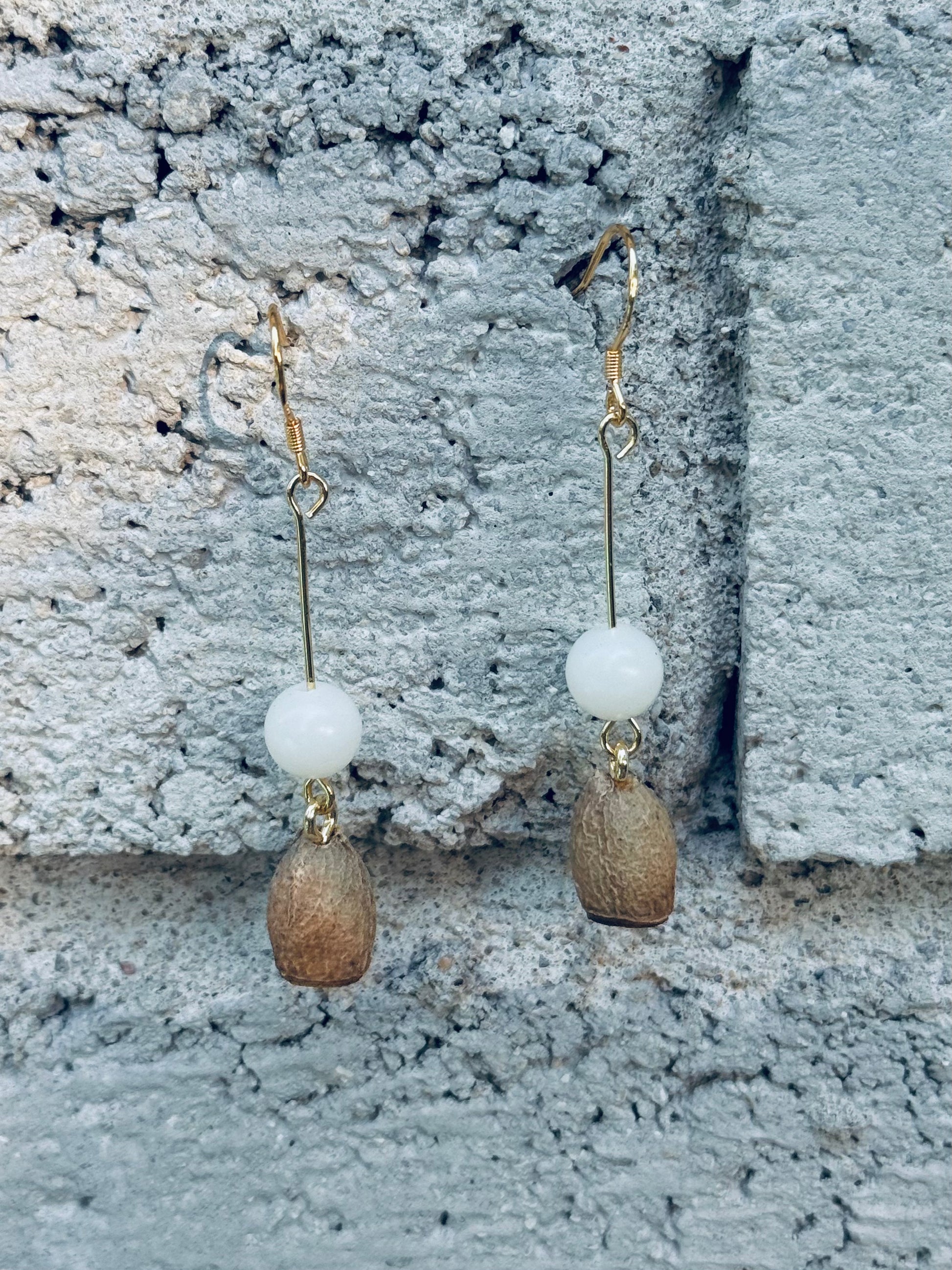 These lightweight earrings pair Lover’s Fruit seed pods (a symbol of deep connection and affection) with smooth, luminous White Jade Bodhi root beads, known for clarity and calm. Finished with 14k gold hooks for a touch of timeless elegance.