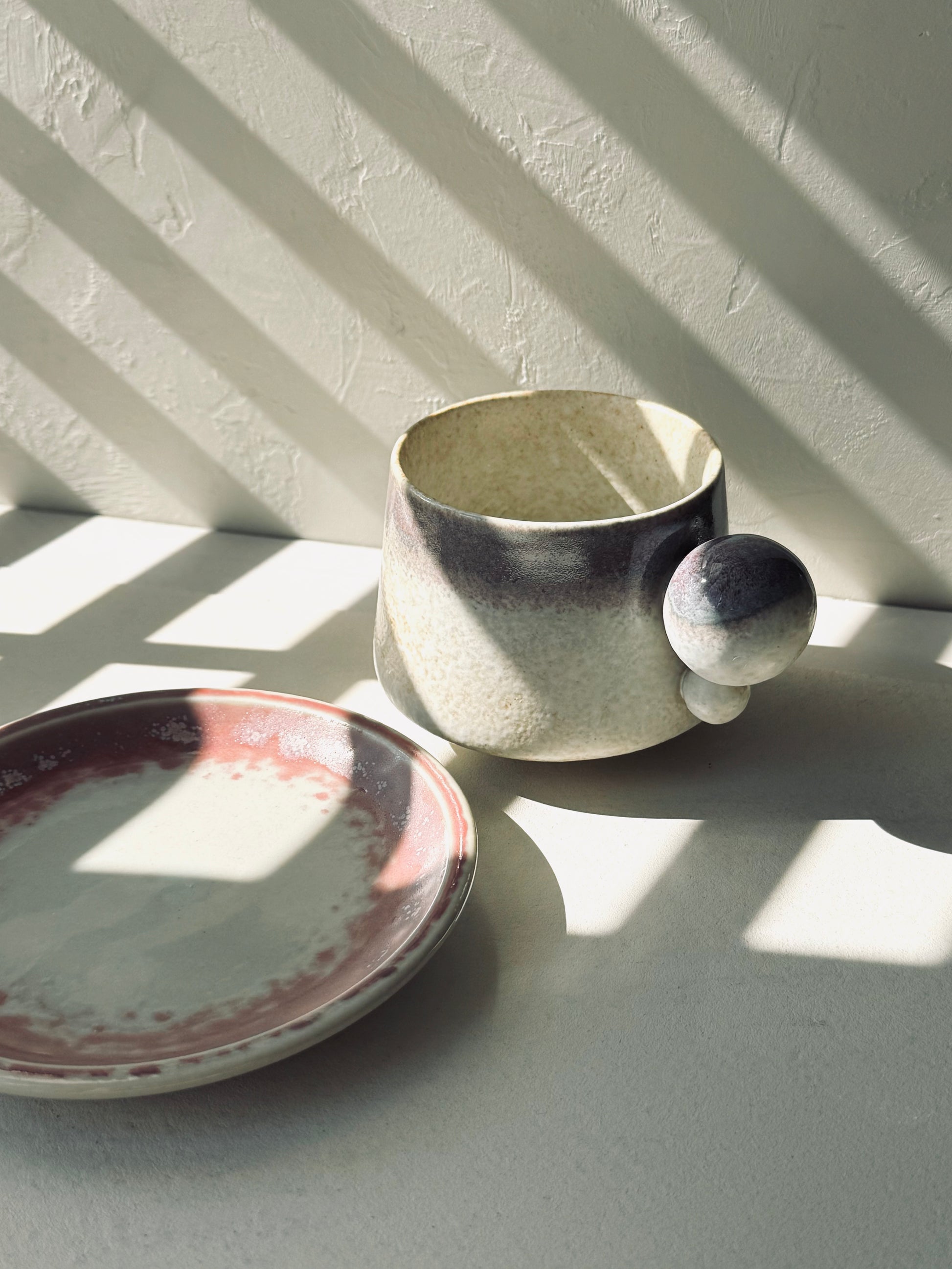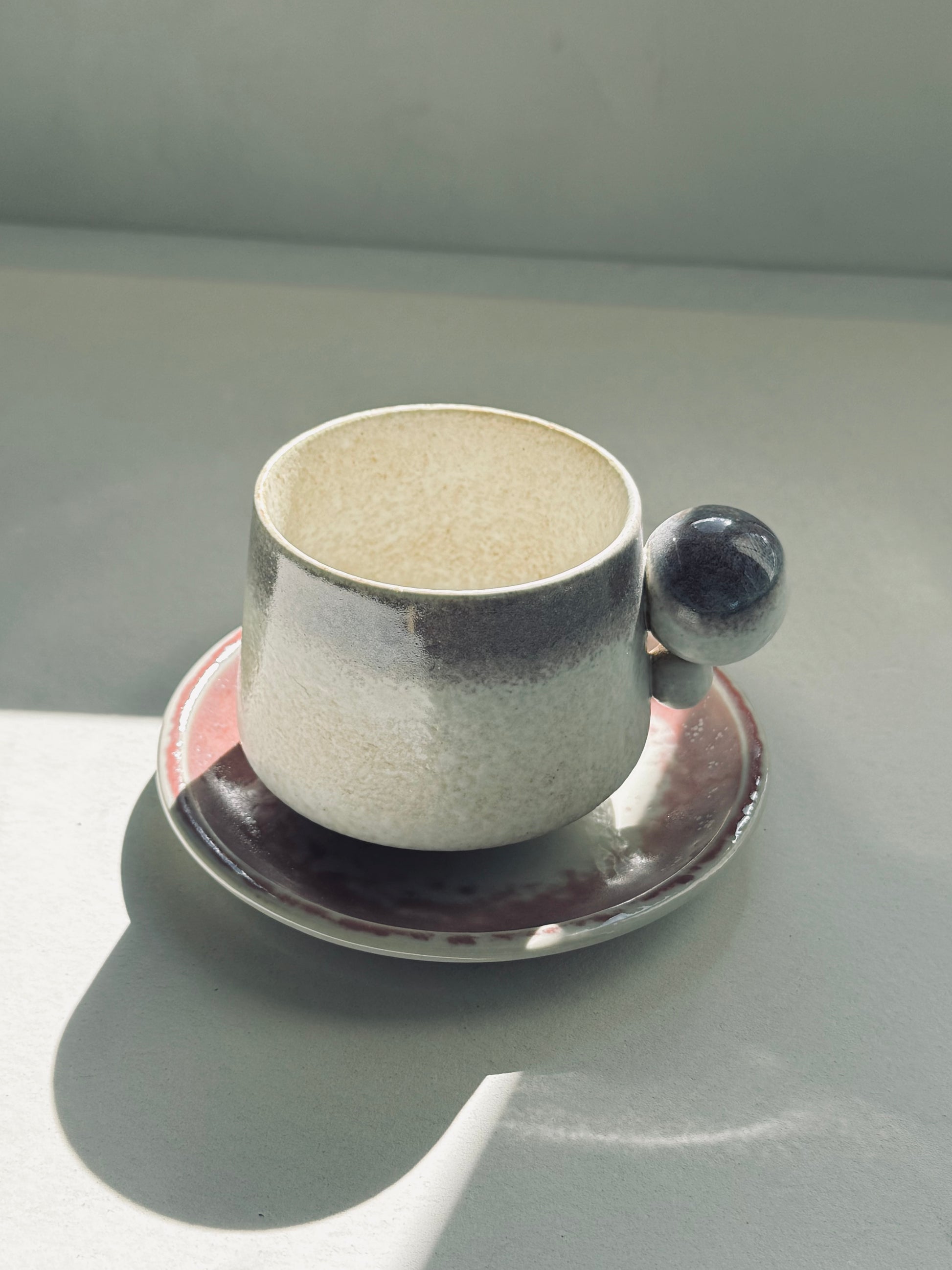 Modern, artistic, and full of character — the Orbit Series Ceramic Mug + Saucer is designed with a bold spherical handle that feels as sculptural as it is functional. Each piece is handcrafted in small batches, with rich layered glazes that make every mug unique