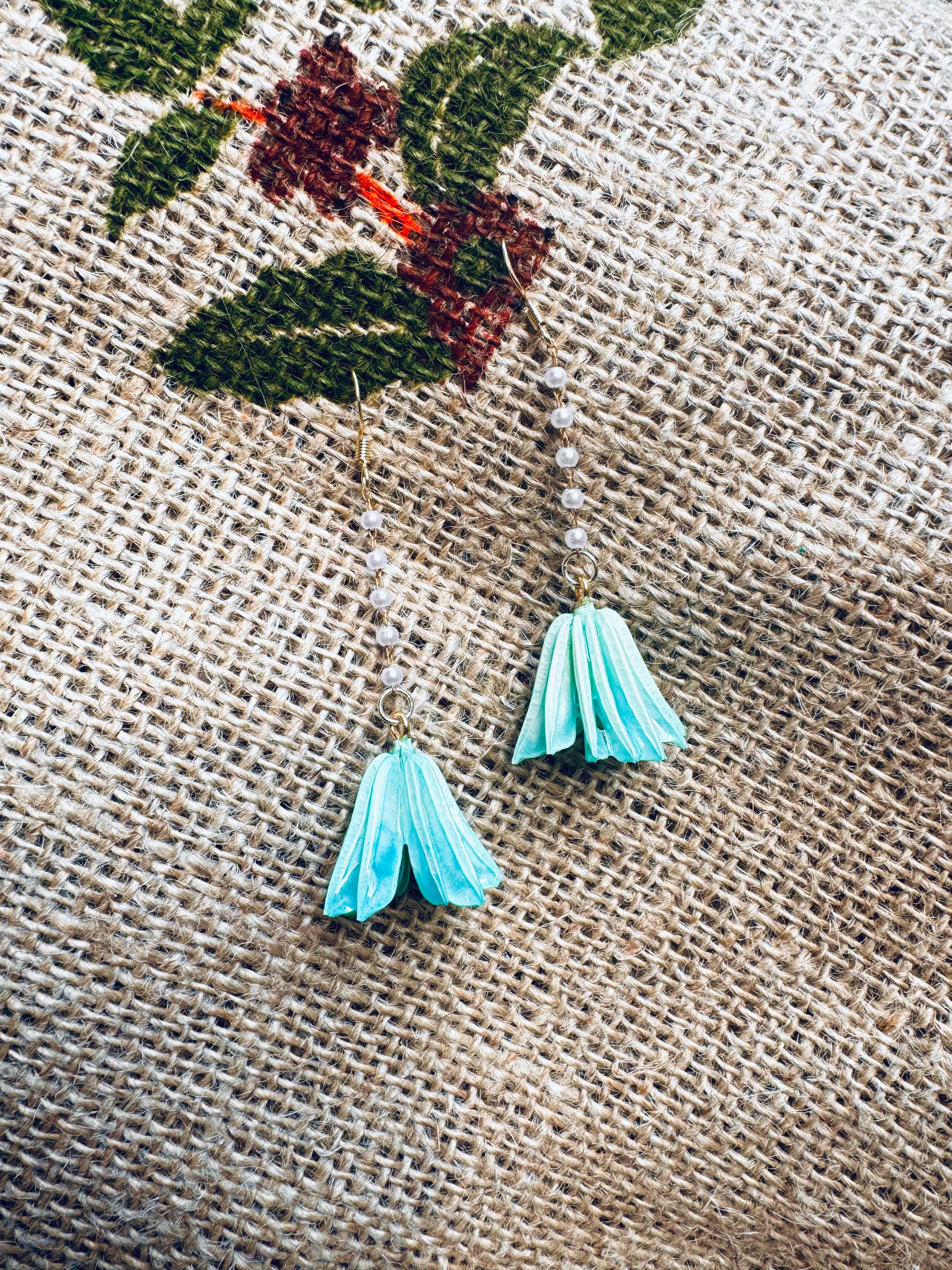 These earrings feature real dried petals dyed in dreamy pastel aqua, paired with delicate faux pearls and finished with 14k gold‑plated hooks.