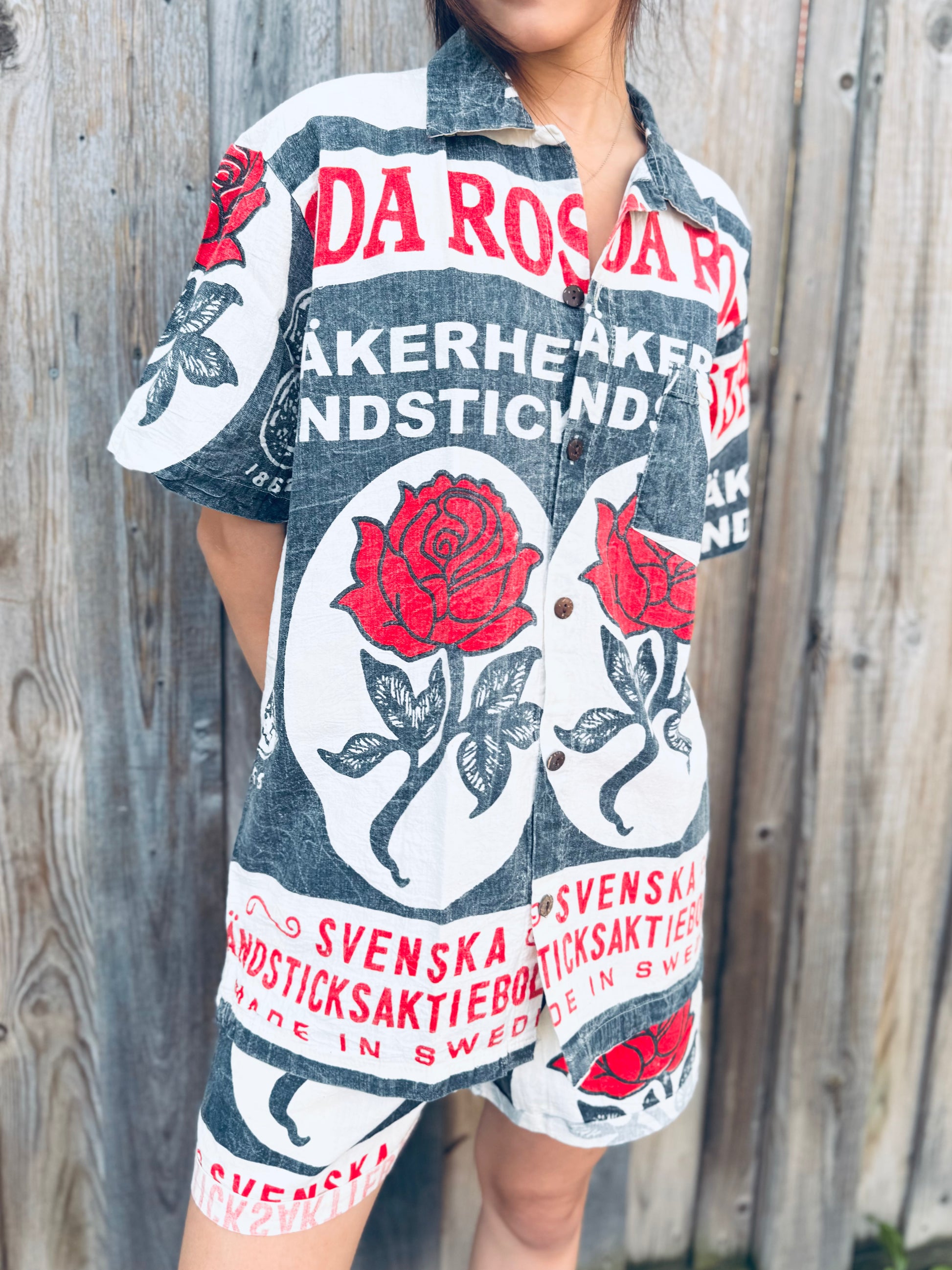 This vintage-style shirt features a striking red rose matchbox print inspired by old Swedish packaging art.