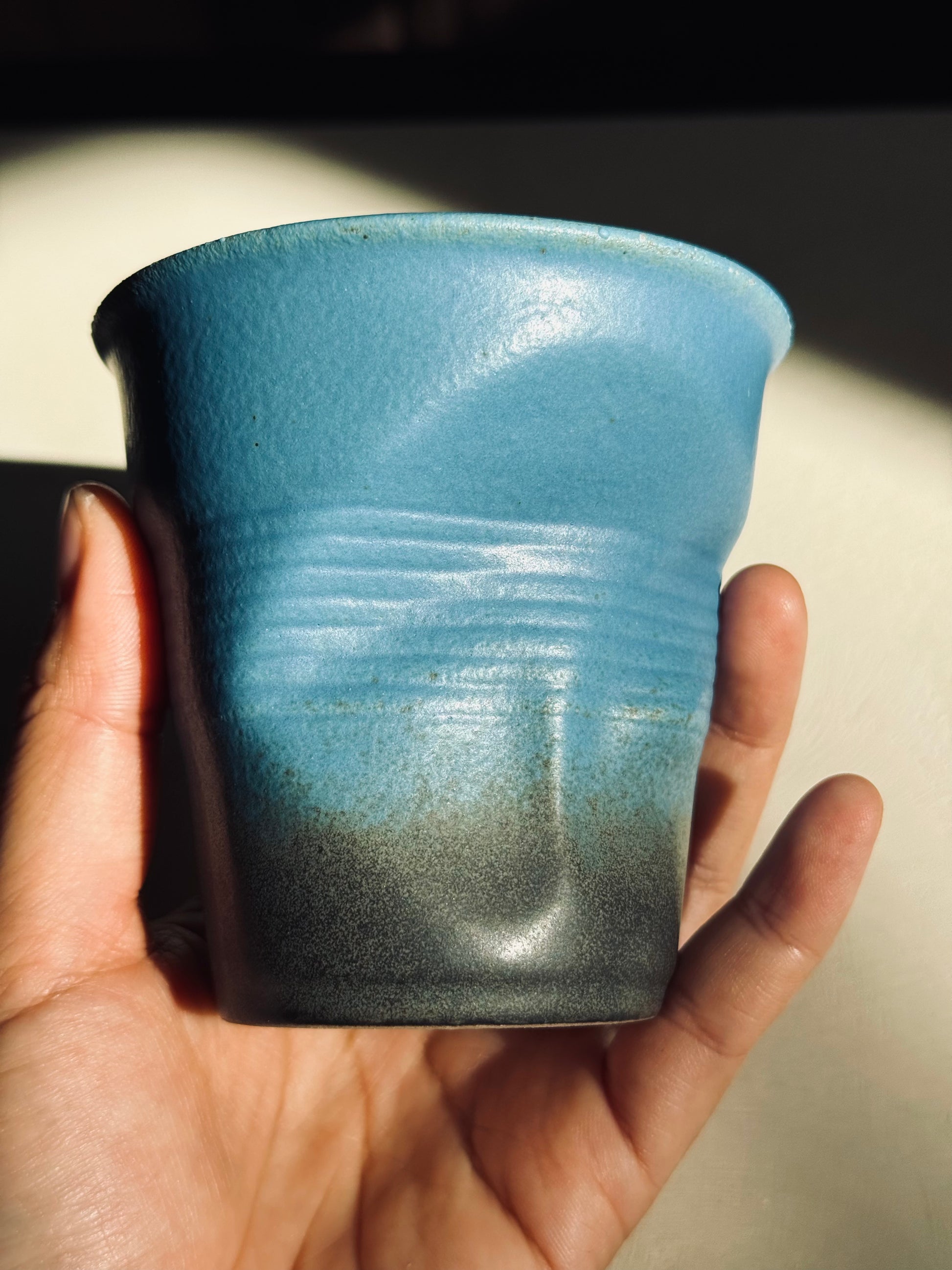 A modern twist on rustic coarse pottery . This stoneware tumbler features a striking gradient glaze, transitioning from deep ocean blue to matte black at the base. Its smooth rim and textured midsection create both comfort and style, perfect for coffee, tea, water, or wine.