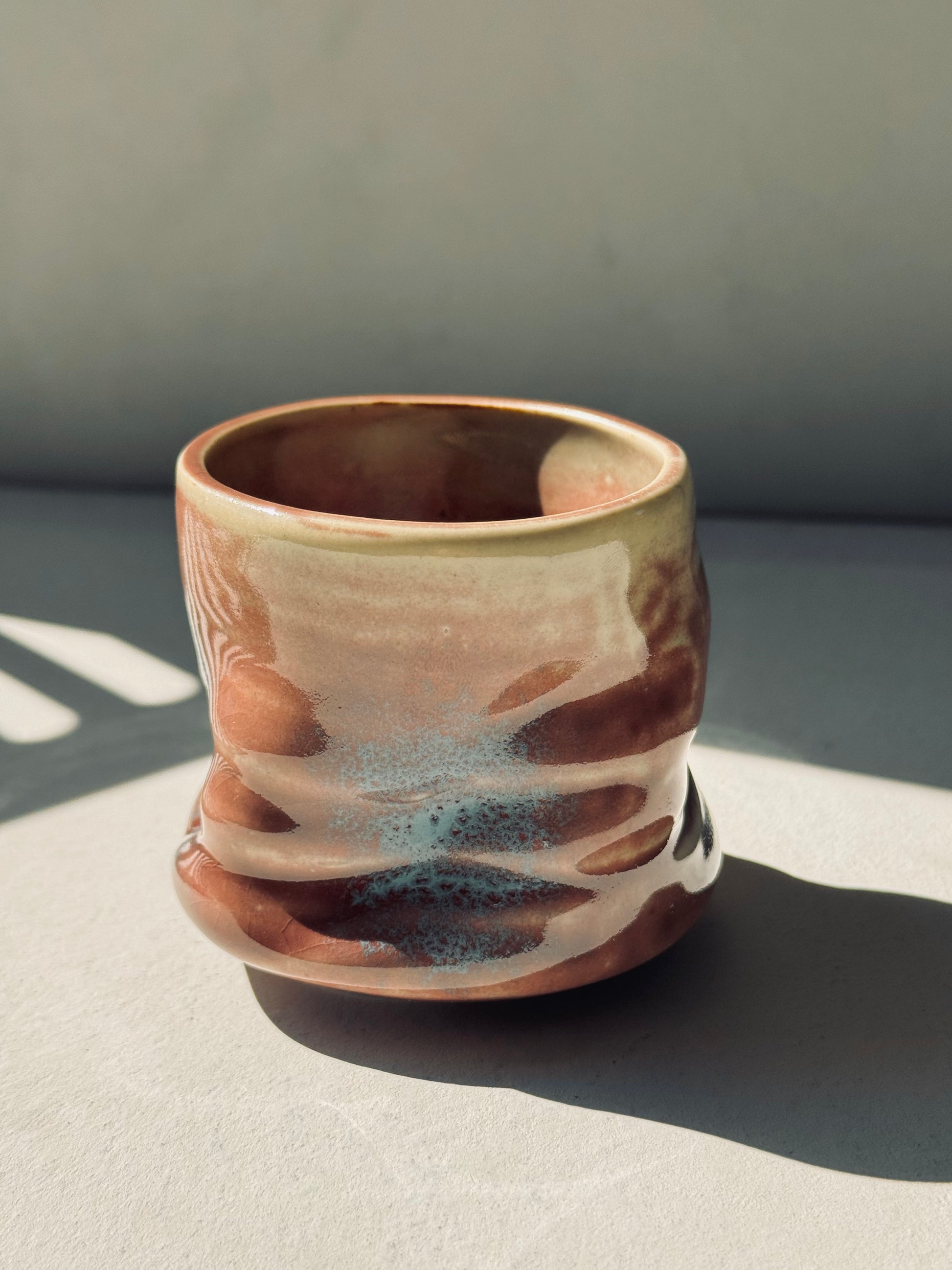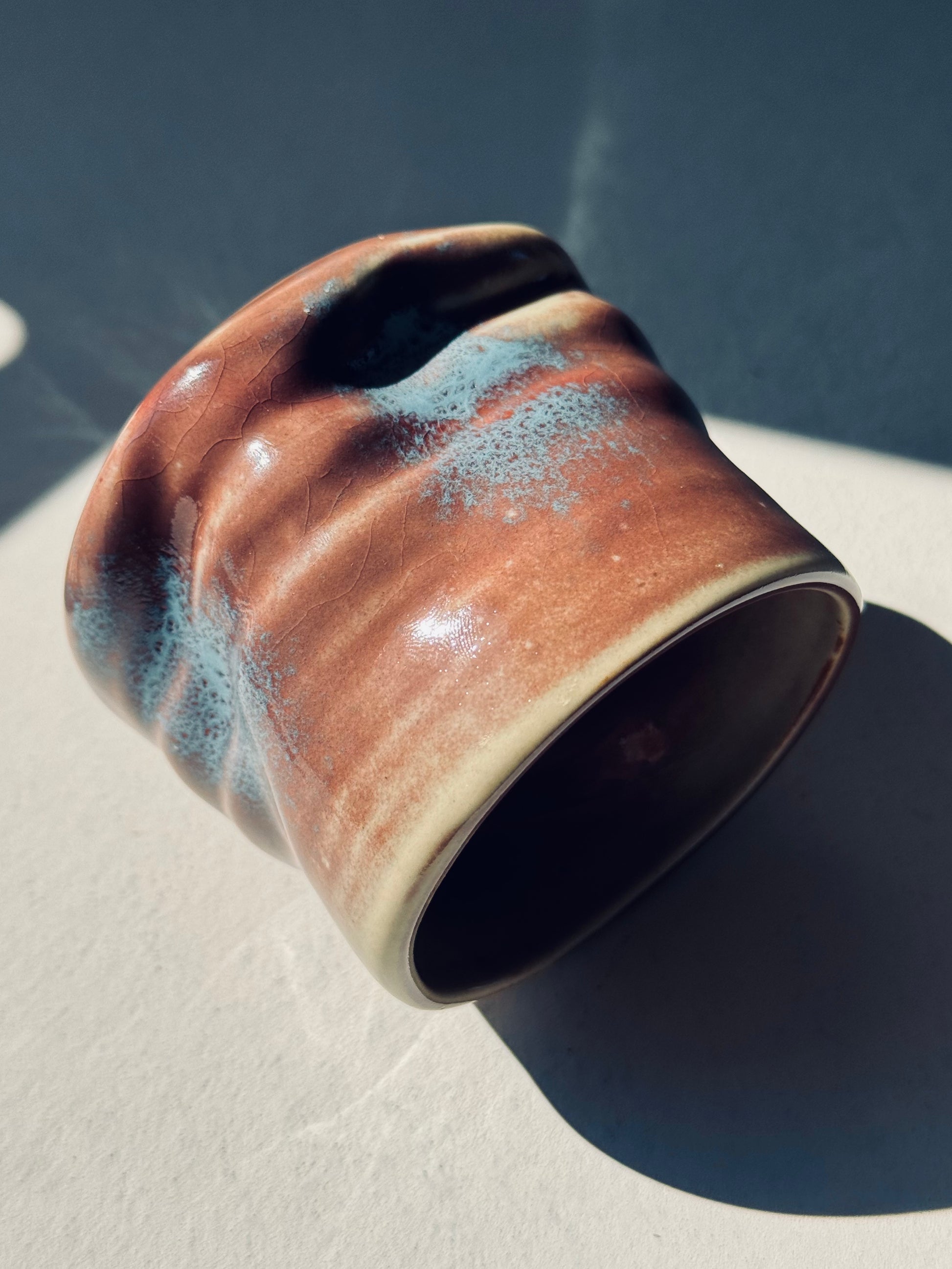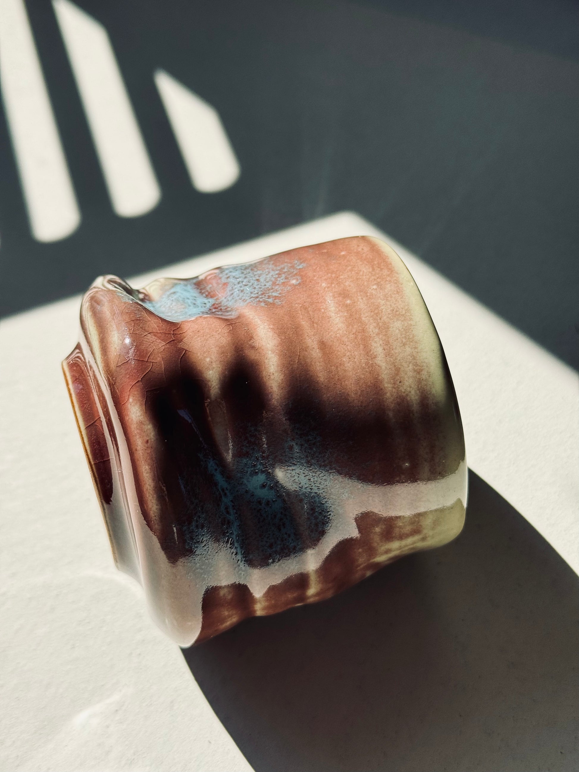 A striking coarse pottery cup with a wavy design and a rich blend of red-brown and blue glaze. The natural flowing glaze creates unique variations in color and texture, making each piece visually captivating. Ideal for tea, coffee, or to showcase as an artisanal accent.