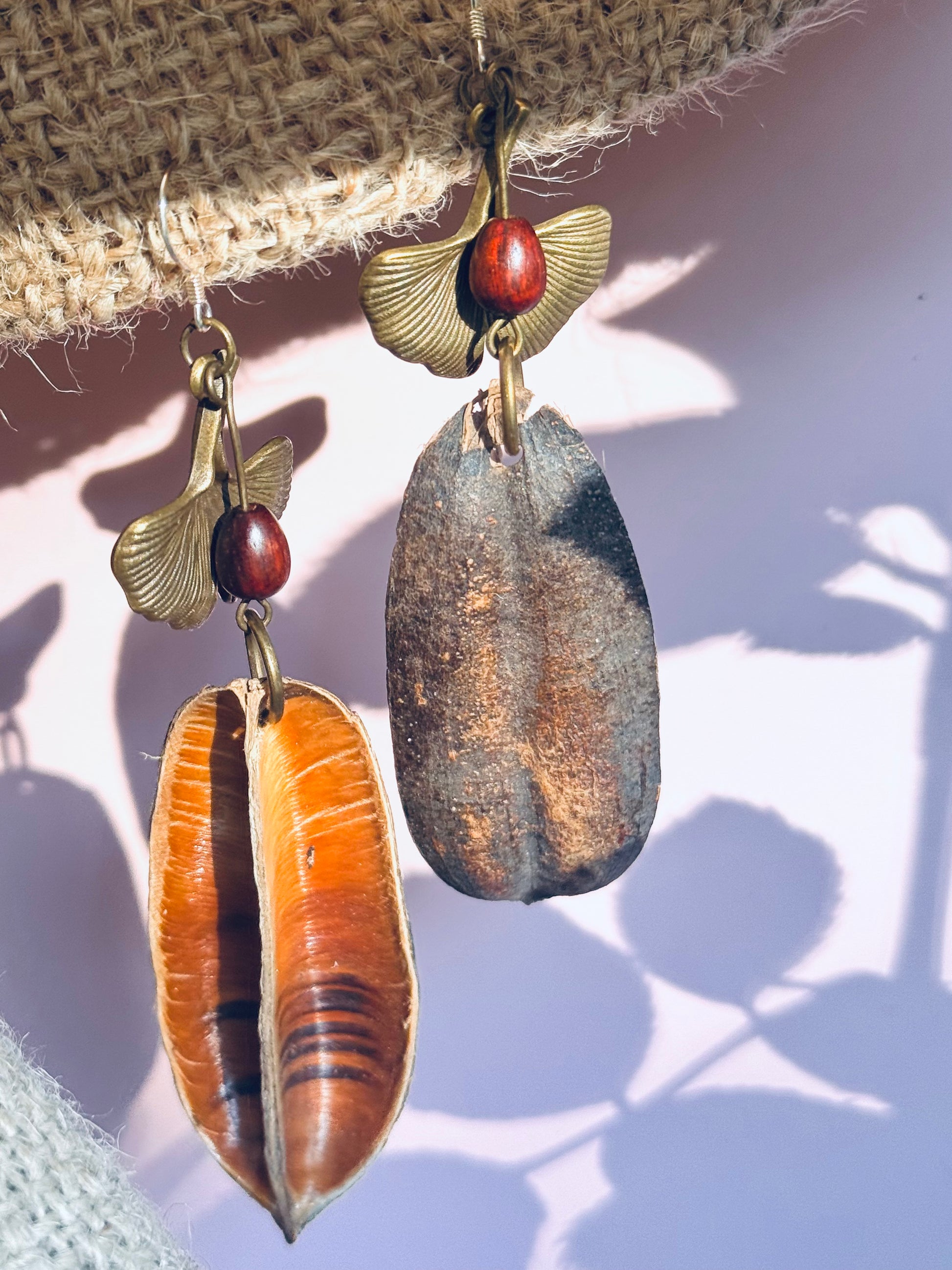 A tribute to wild elegance. These earrings feature naturally dried sisal fruit pods with their beautiful earthy stripes, paired with a deep red blood sandalwood bead and antique bronze ginkgo leaf detail. Hung on silver hooks, they’re lightweight, grounded, and unmistakably bold.