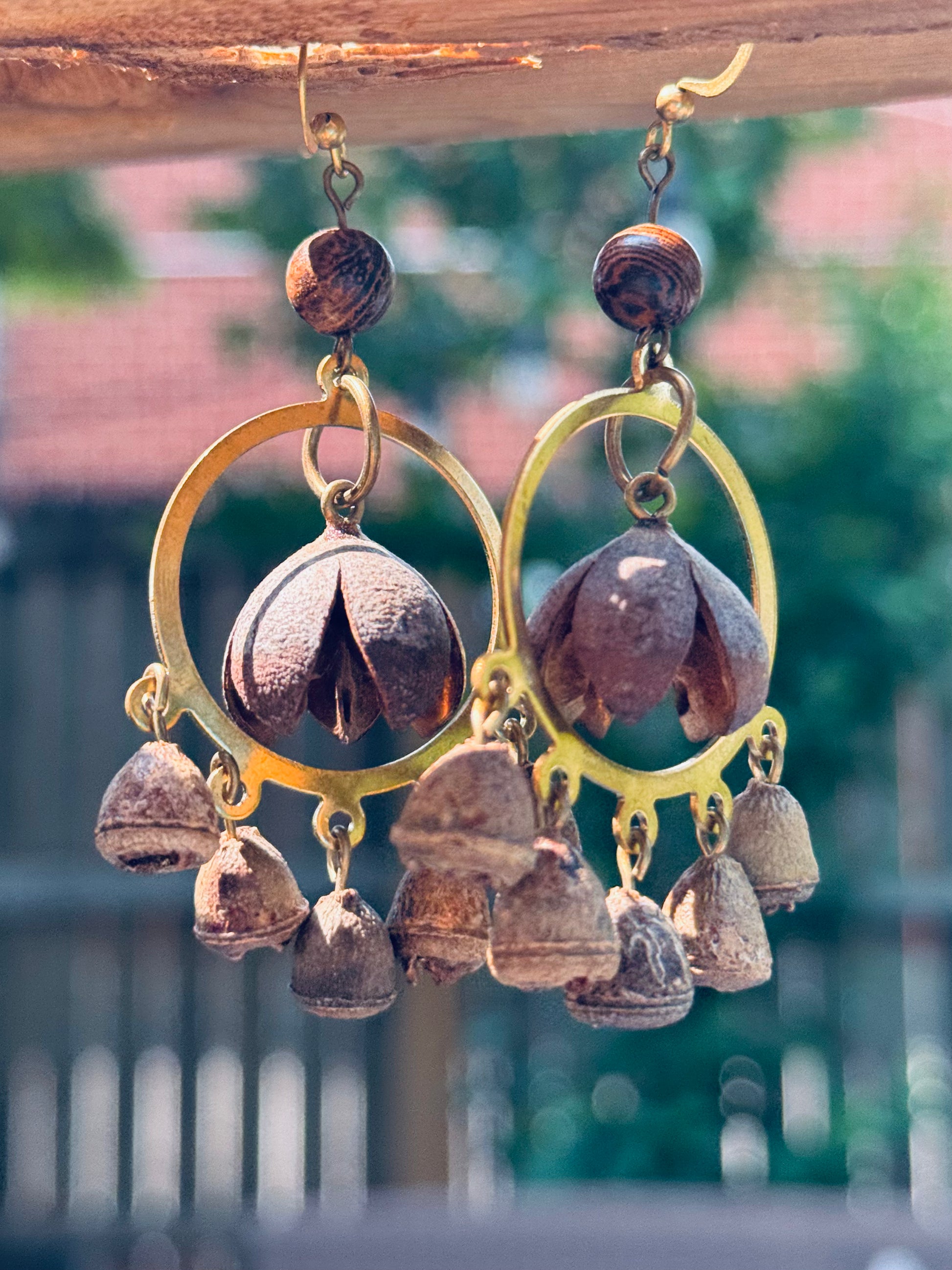 Bring the joy of the forest to your ears with these earthy statement earrings, handcrafted from smiling seed pods, copper hoops, bell pods, and polished sandalwood beads. Each pair is naturally formed and completely one of a kind – just like you.