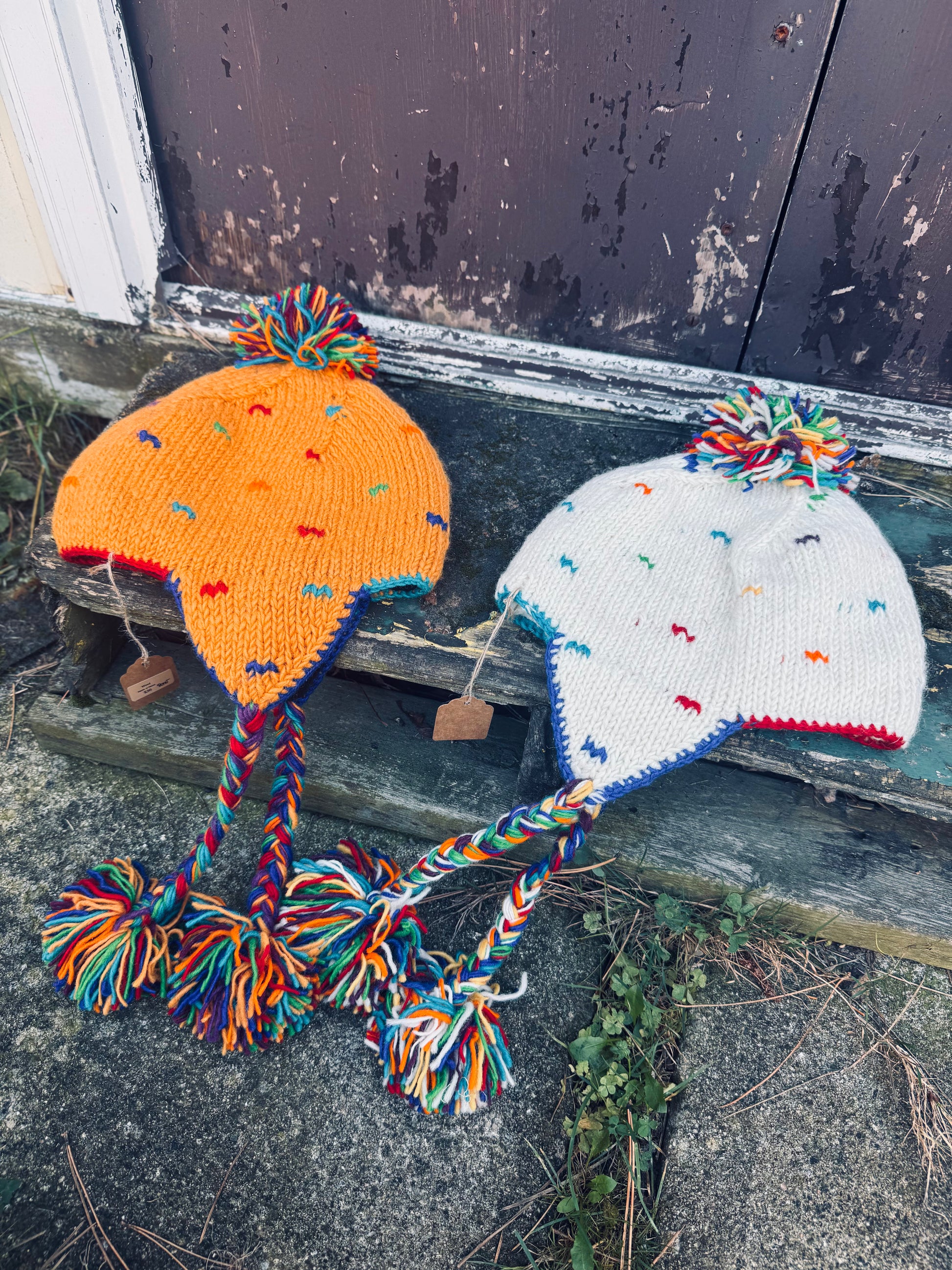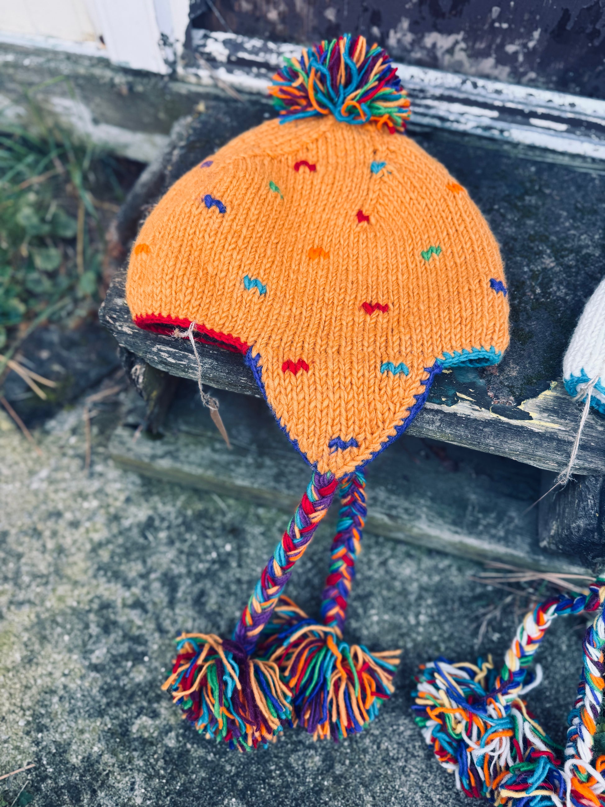 🧡 “Snow Carnival” Wool Earflap Hat – Handmade in Nepal 🇳🇵