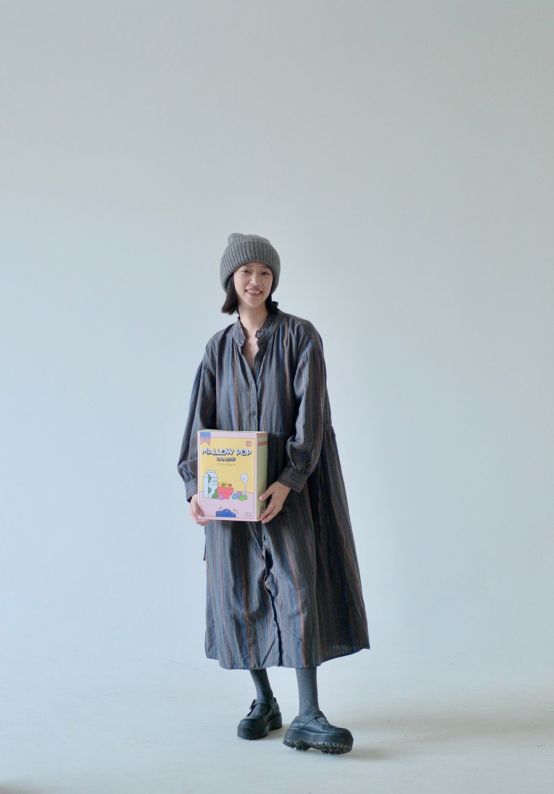 A soft cotton dress crafted in Japan with a smooth, breathable feel. Designed with a button-down front and adjustable waist ties, it offers a relaxed silhouette that’s easy to style for everyday wear. Subtle multicolor stripes add a vintage-inspired charm.