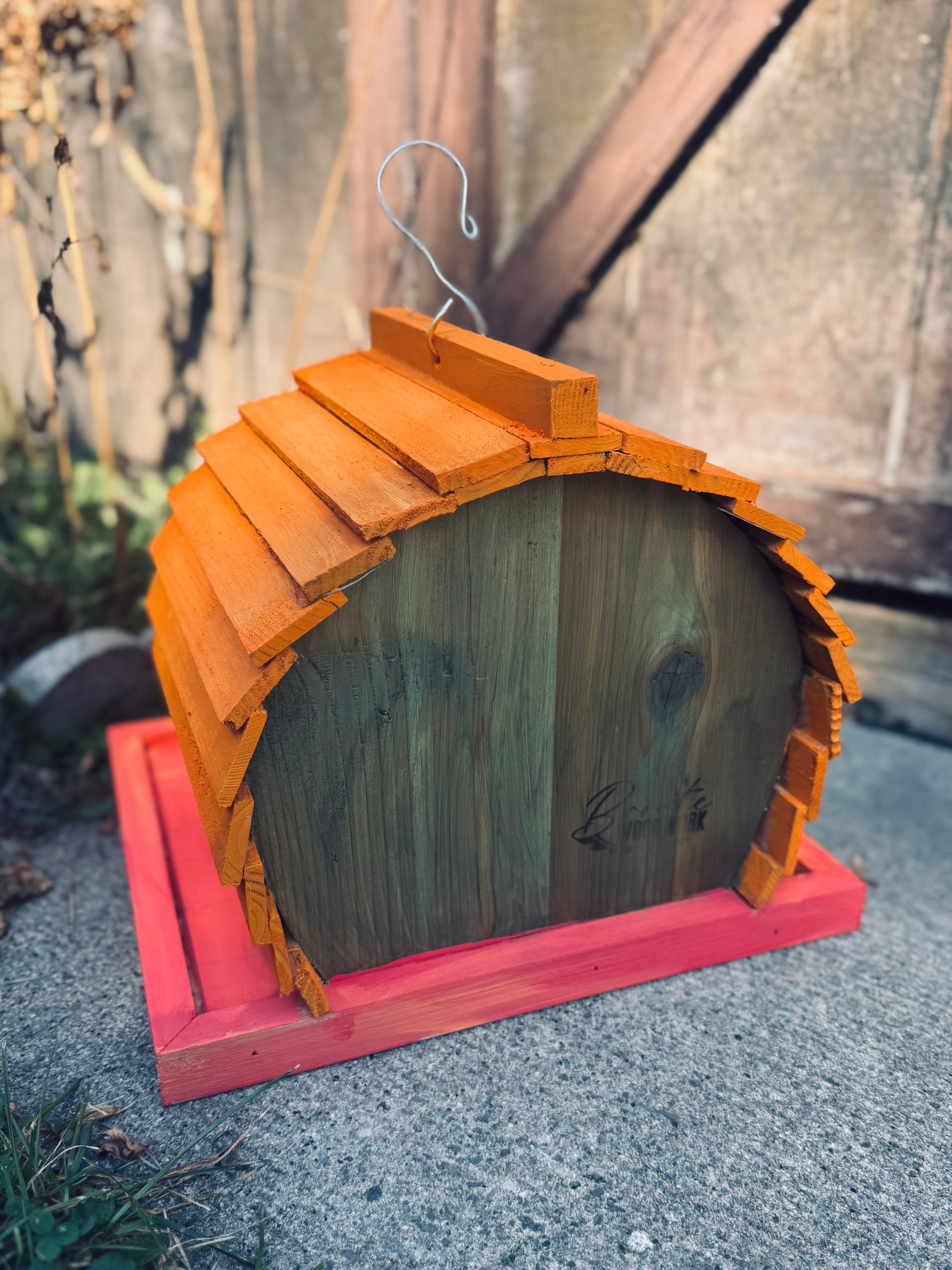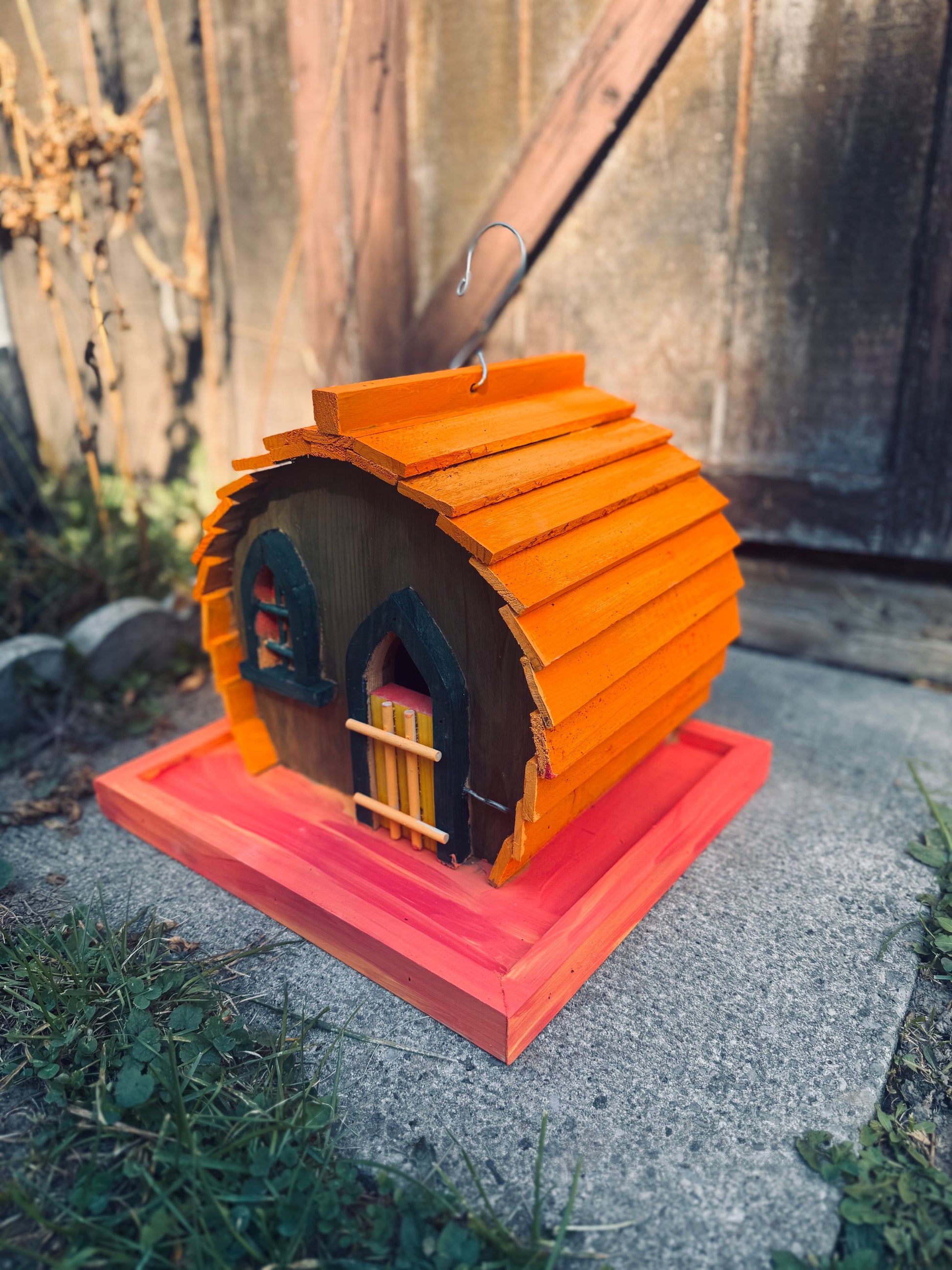 Bring warmth and whimsy to your garden with our Sunset Cottage Birdhouse, crafted entirely by hand from premium Canadian cedar and finished in glowing orange and deep green hues — inspired by golden-hour light and cozy autumn charm. 🍂