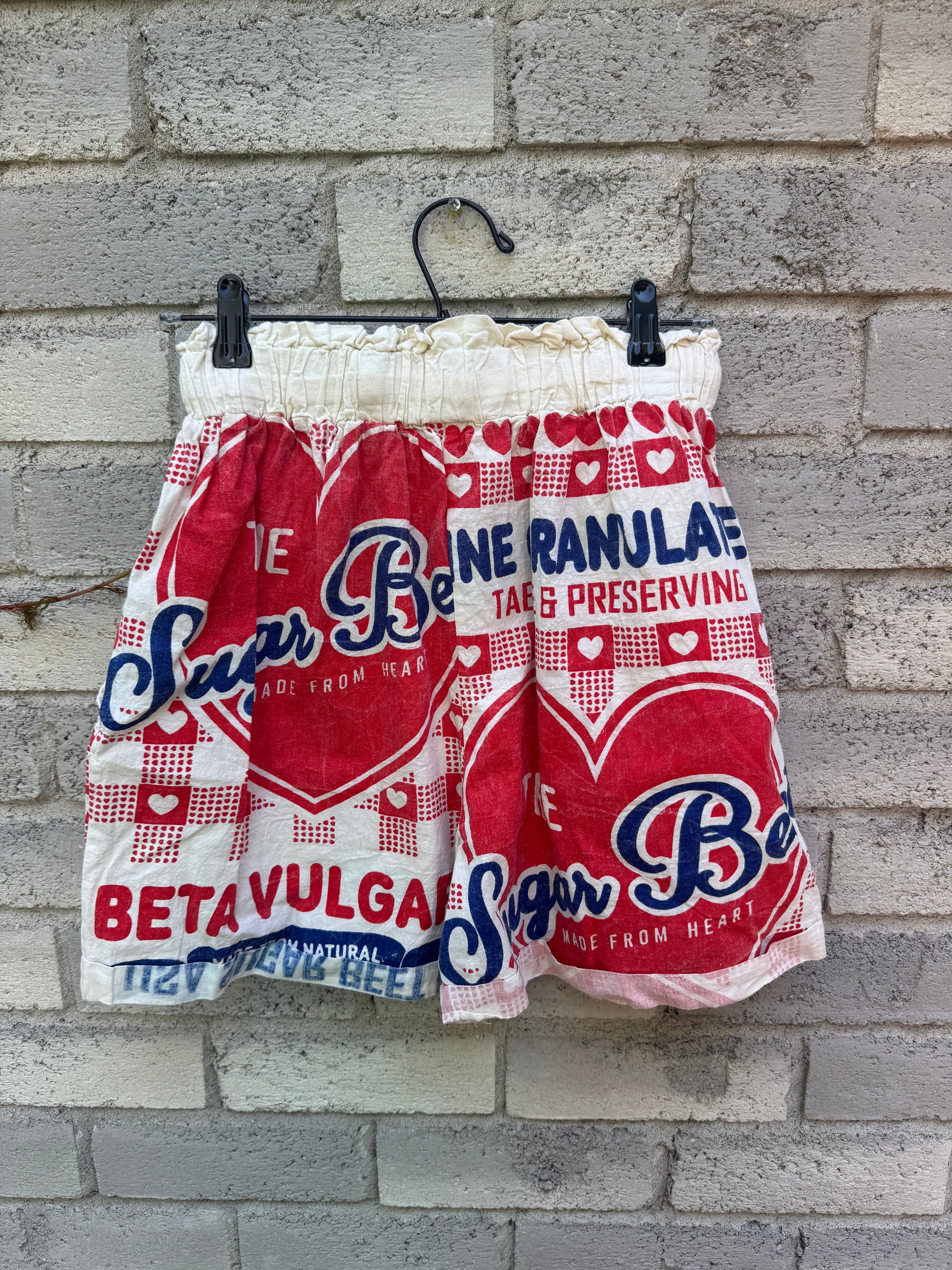 These washed‑cotton shorts feature a special vintage finish and bold sack‑print patchwork graphics, giving them that relaxed, one‑of‑a‑kind charm. Designed with an elastic waist and adjustable drawstring for all‑day comfort — perfect for styling with your favorite cami or tee.