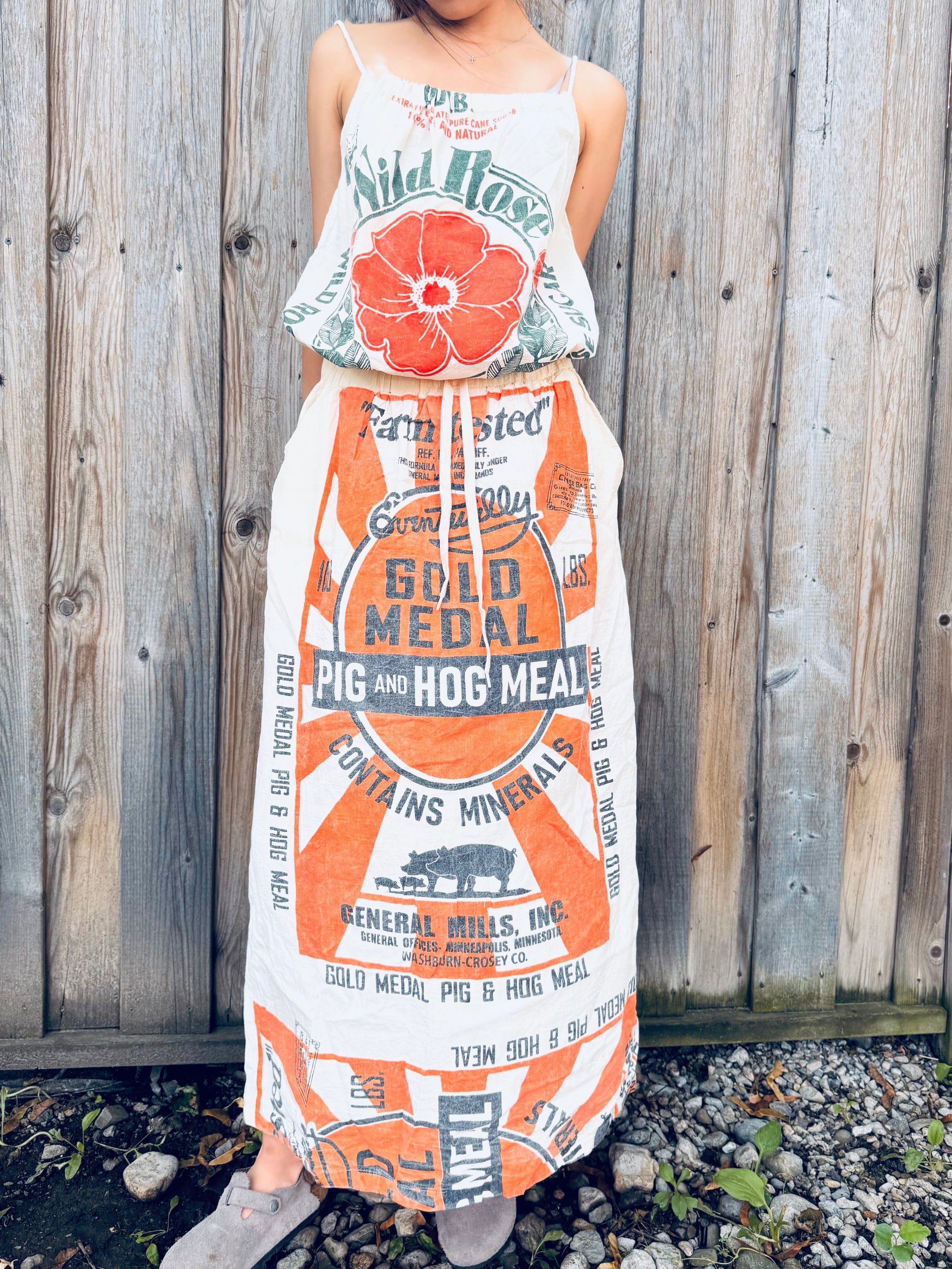 The bold floral and feed‑sack graphics make it truly one of a kind. Featuring an adjustable drawstring waist for a flexible fit and a long, flowy silhouette that’s easy and comfortable to wear.