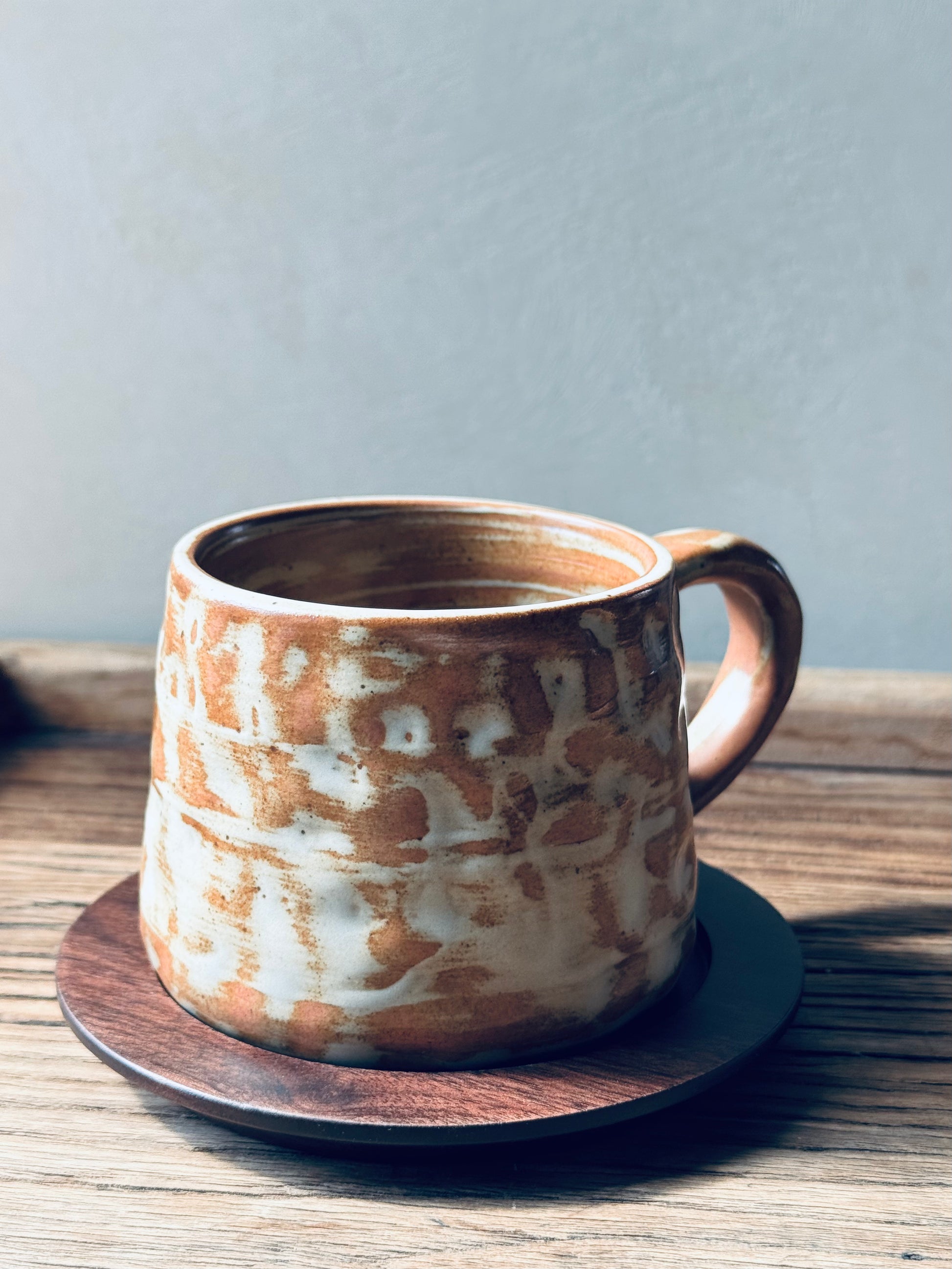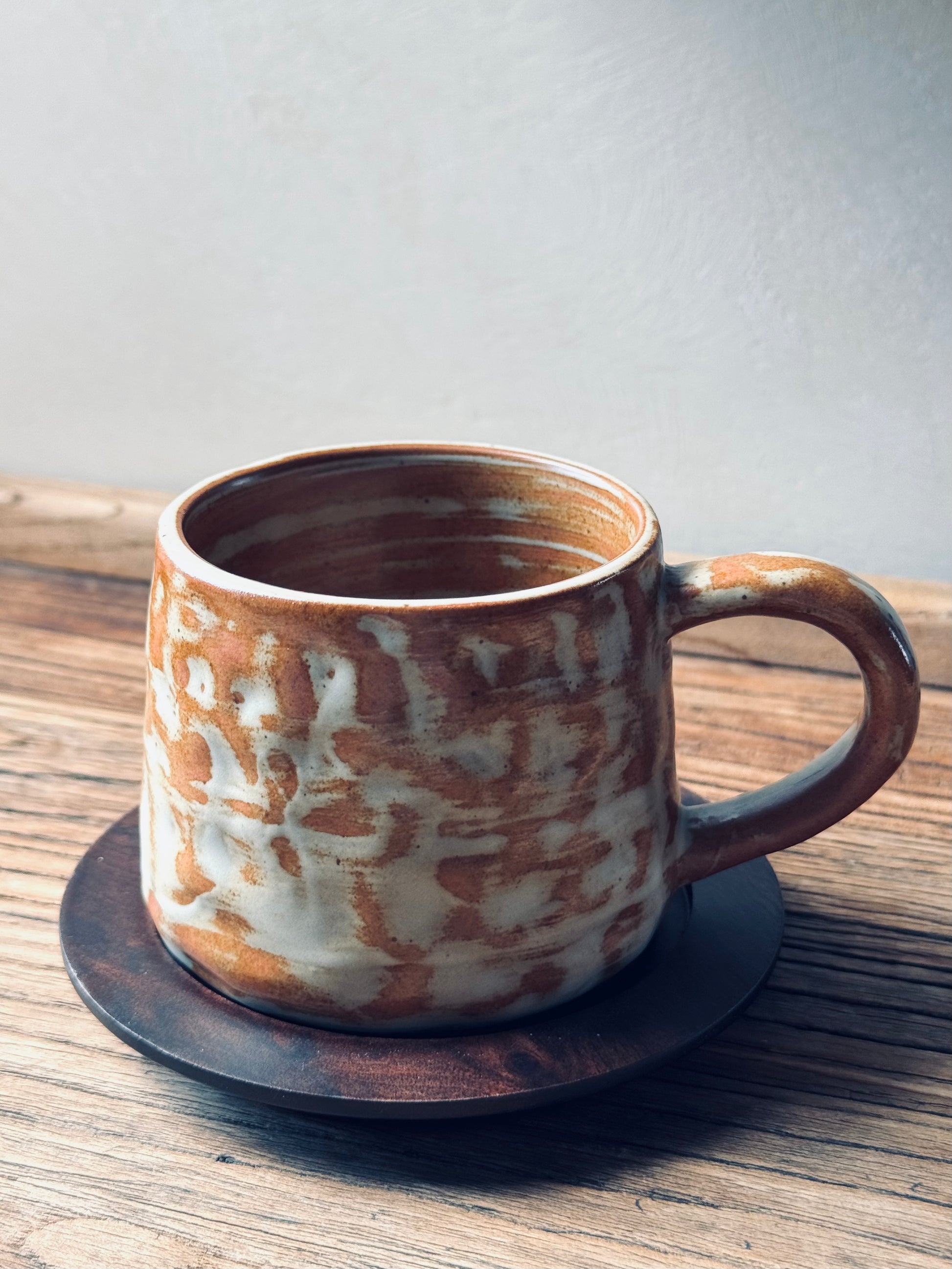 Rooted in the Japanese philosophy of wabi-sabi, this ceramic mug celebrates natural imperfection and rustic beauty. Each piece is shaped by hand, glazed with earthy tones, and paired with a smooth wooden saucer for a grounded, timeless design.