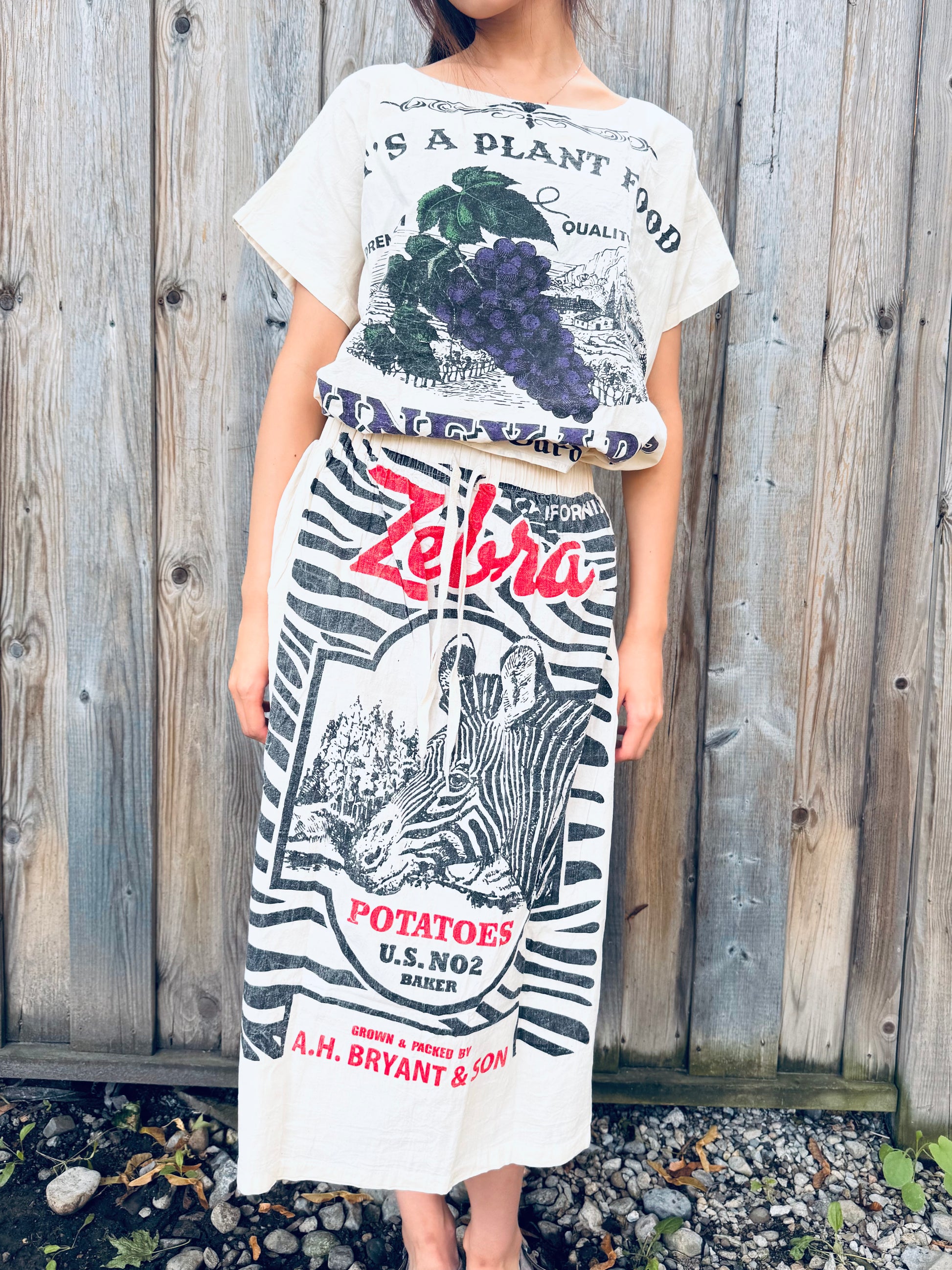 Stand out with this bold reworked midi skirt featuring an authentic potato sack print—complete with a striking zebra motif and vivid typography.