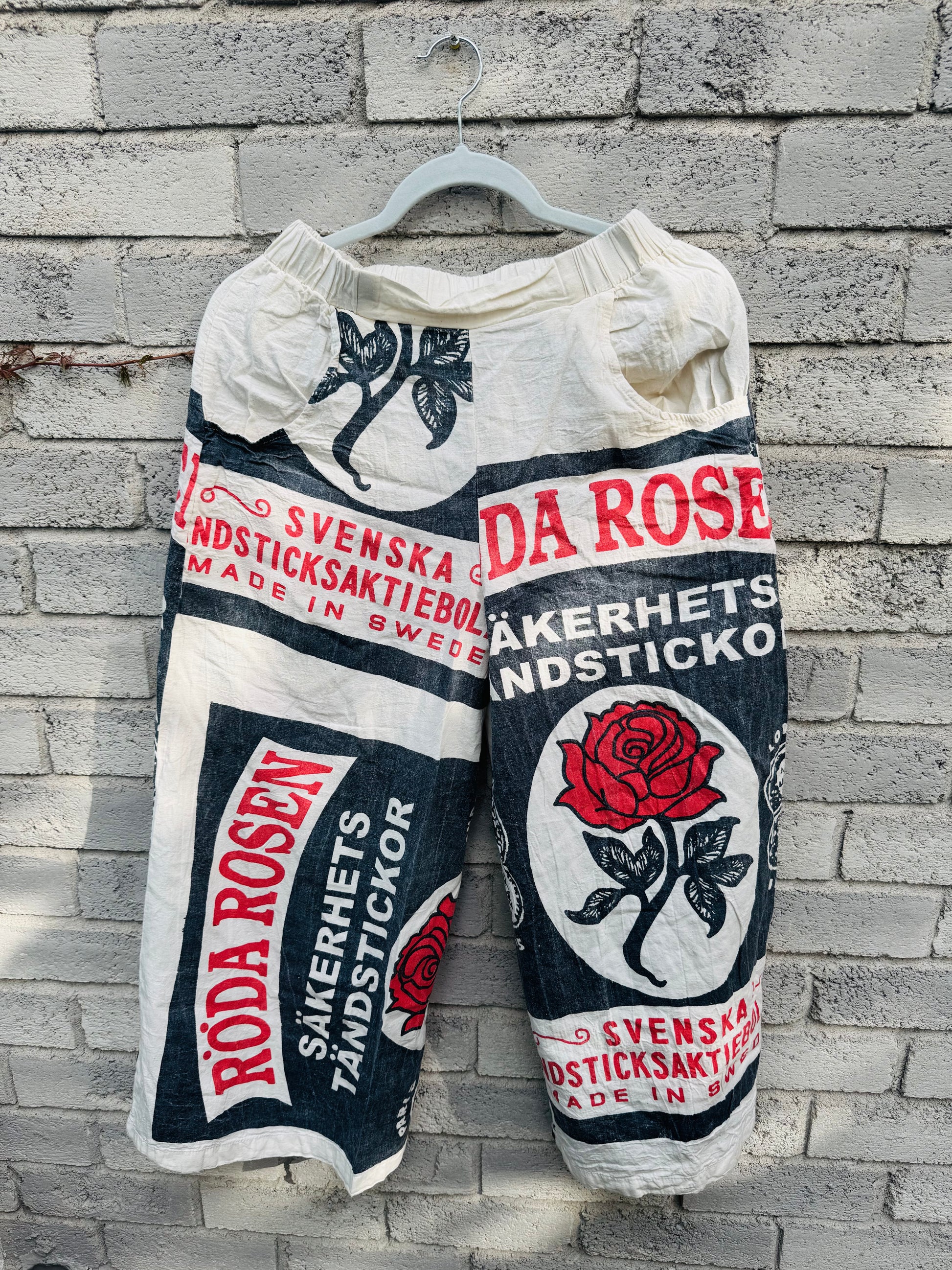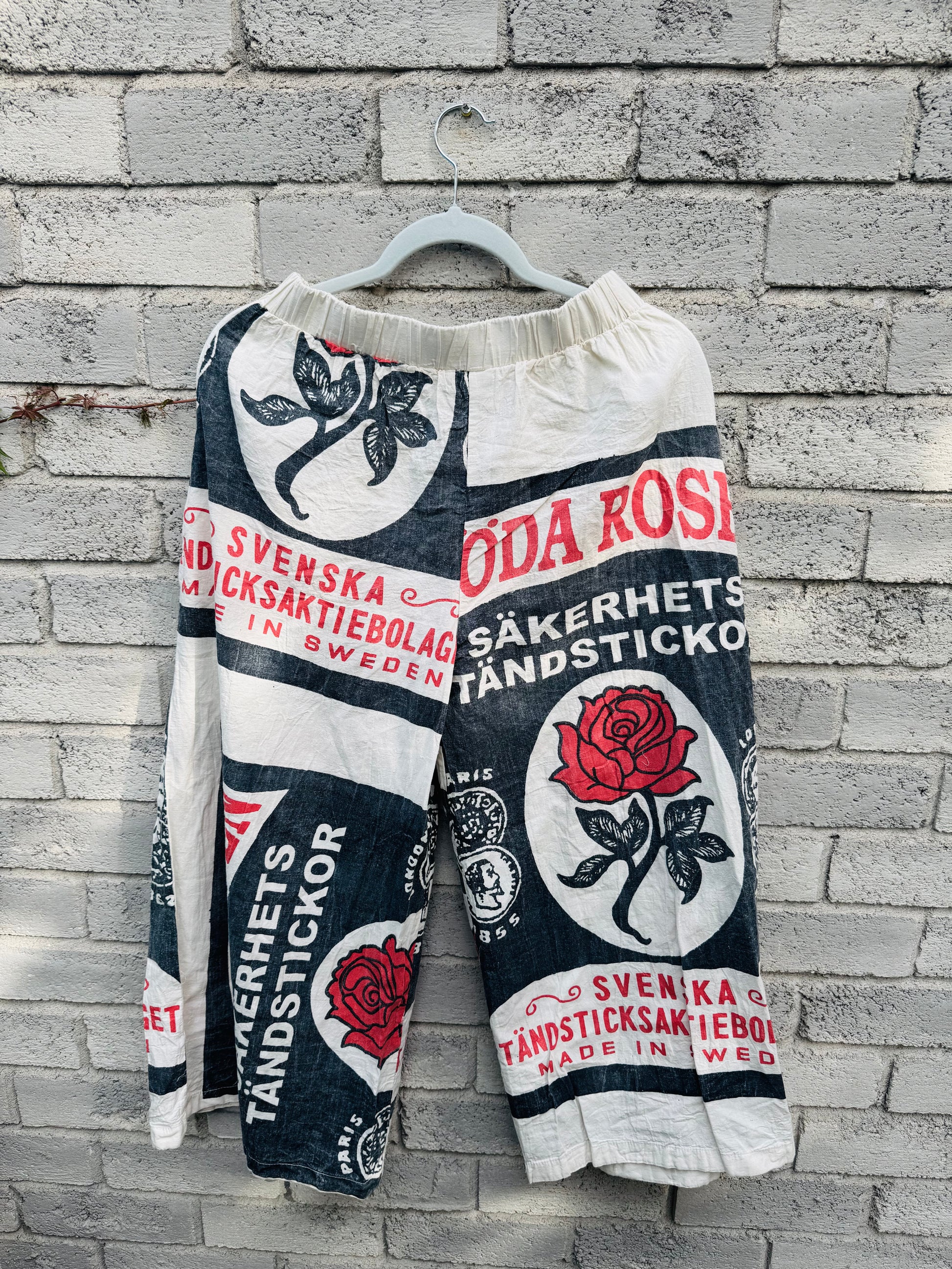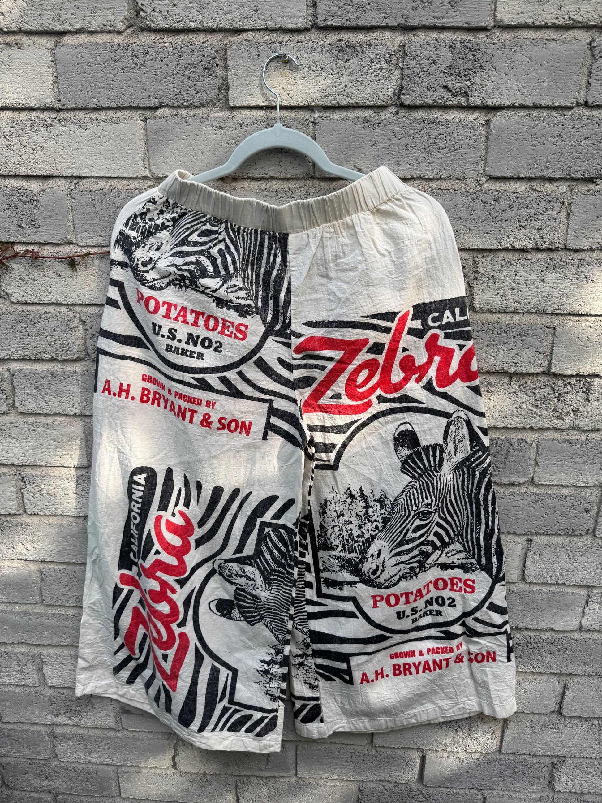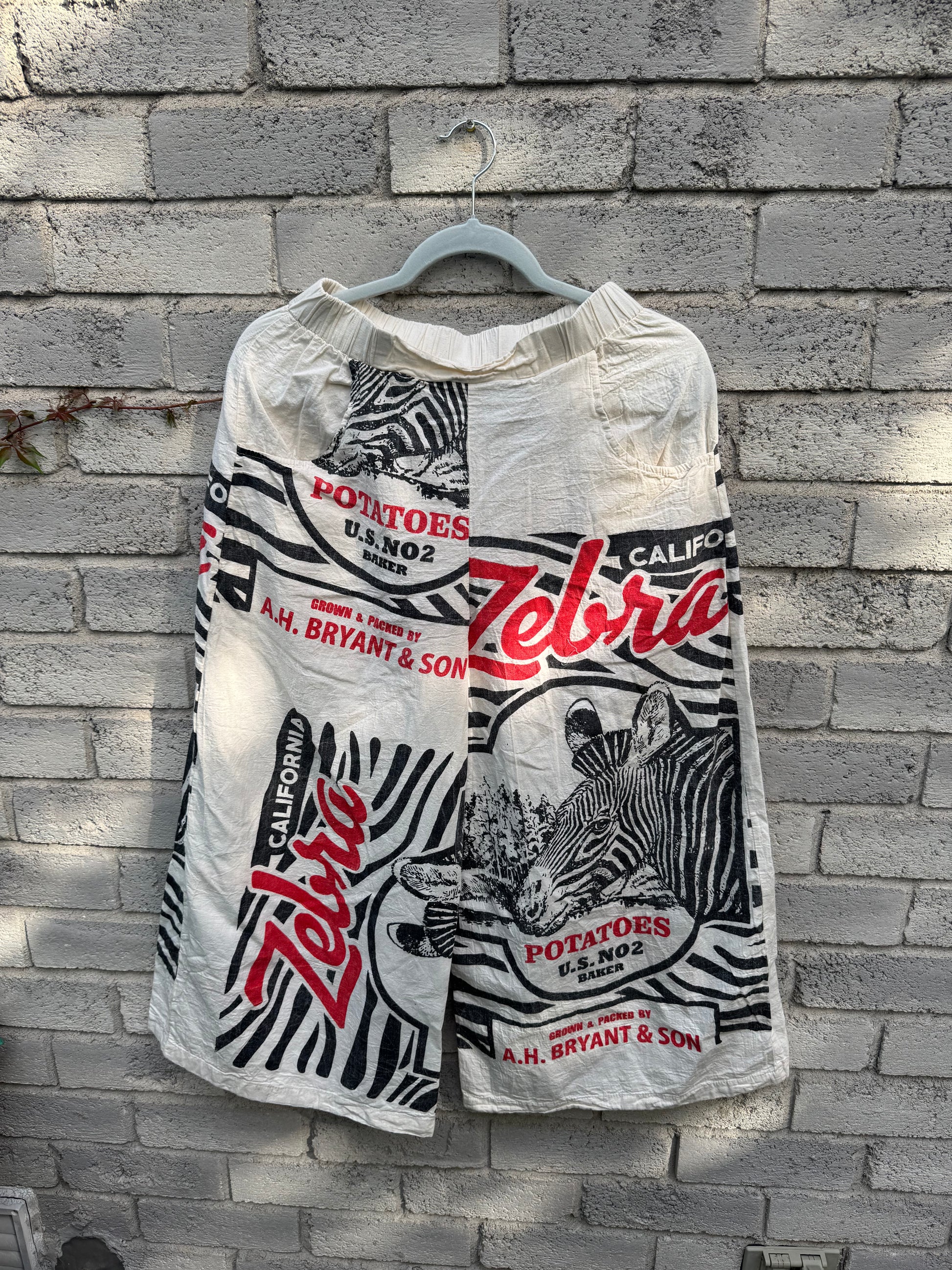 These statement pants are crafted from repurposed-style vintage feed sack prints β featuring playful potato typography and a proud zebra graphic thatβs full of attitude. The wide-leg cut gives them an airy, effortless flow β a true conversation piece for your everyday wardrobe.